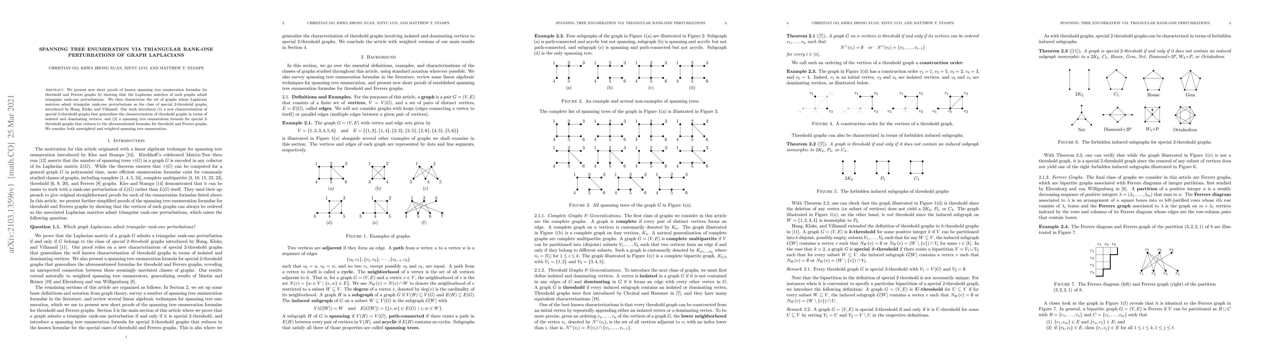 We present new short proofs of known spanning tree enumeration formulae for threshold and Ferrers graphs by showing that the Laplacian matrices of such graphs admit triangular rank-one perturbations. We then characterize the set of graphs whose Laplacian matrices admit triangular rank-one perturbations as the class of special 2-threshold graphs, introduced by Hung, Kloks, and Villaamil. Our work introduces (1) a new characterization of special 2-threshold graphs that generalizes the characterization of threshold graphs in terms of isolated and dominating vertices, and (2) a spanning tree enumeration formula for special 2-threshold graphs that reduces to the aforementioned formulae for threshold and Ferrers graphs. We consider both unweighted and weighted spanning tree enumeration.