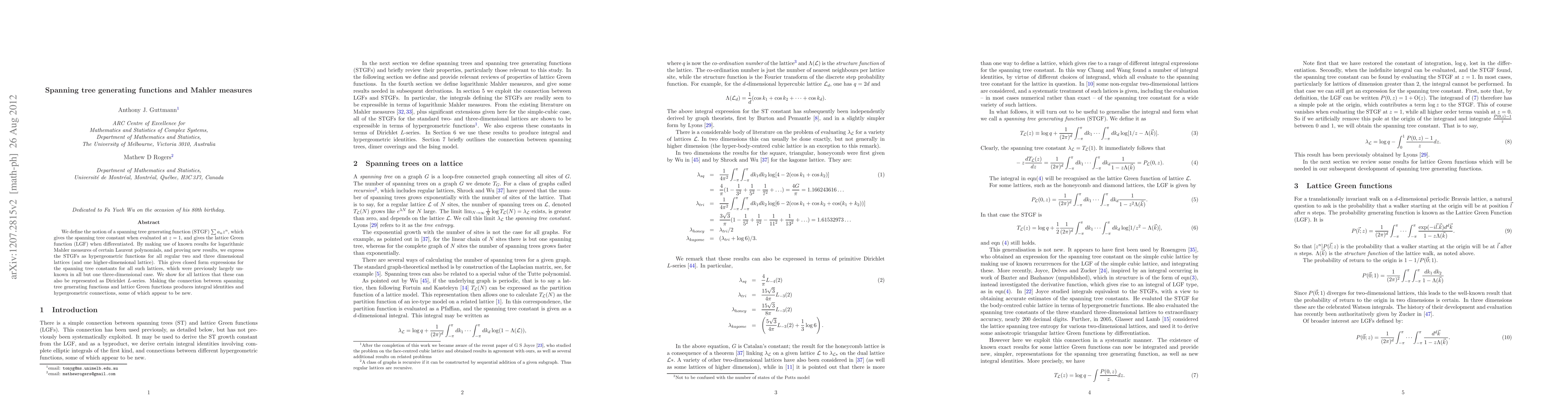 This paper introduces spanning tree generating functions (STGF) and connects them to lattice Green functions, expressing STGFs as hypergeometric functions for regular two and three-dimensional lattices. It provides closed-form expressions for previously unknown spanning tree constants and reveals new integral identities and hypergeometric connections.