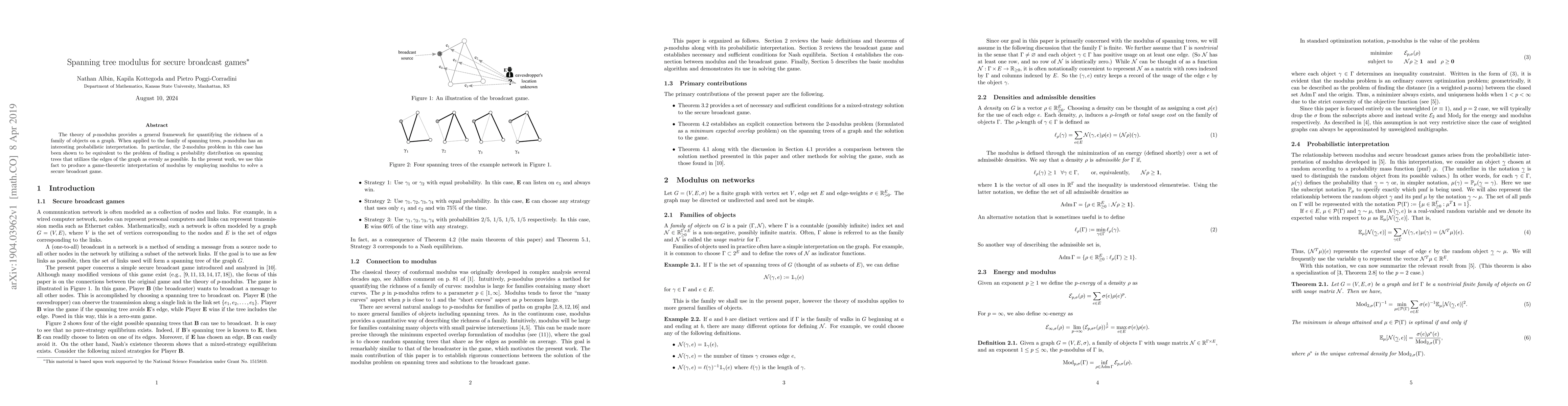 Researchers develop a game-theoretic interpretation of spanning tree modulus to solve secure broadcast games, utilizing the edges of a graph as evenly as possible. They achieve this by applying the theory of p-modulus to find an optimal probability distribution on spanning trees.