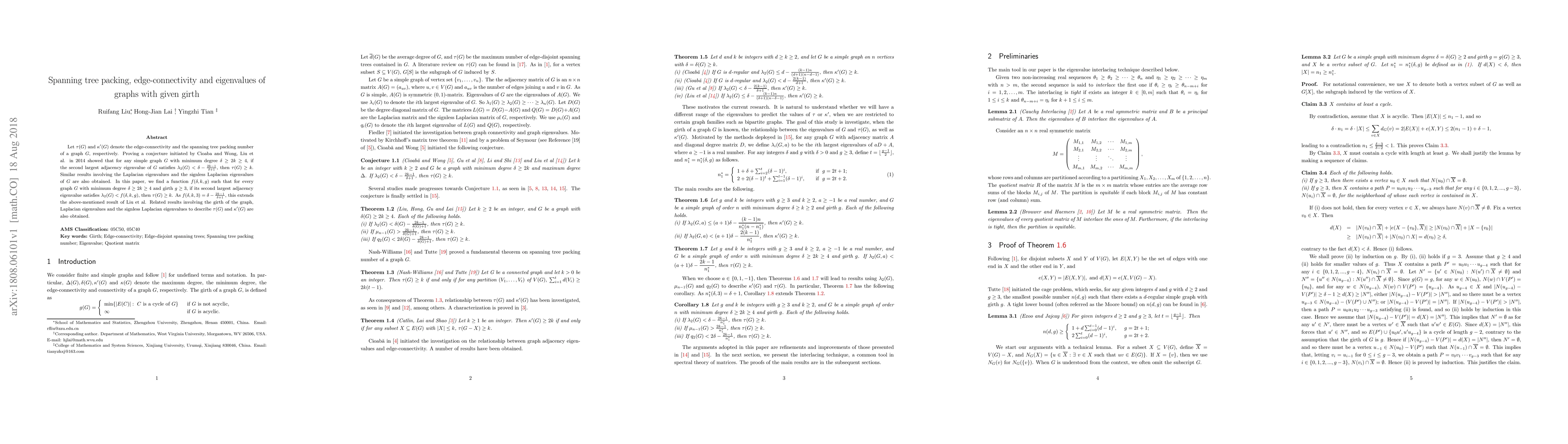 Let $\tau(G)$ and $\kappa'(G)$ denote the edge-connectivity and the spanning tree packing number of a graph $G$, respectively. Proving a conjecture initiated by Cioaba and Wong, Liu et al. in 2014 showed that for any simple graph $G$ with minimum degree $\delta \ge 2k \ge 4$, if the second largest adjacency eigenvalue of $G$ satisfies $\lambda_2(G) < \delta - \frac{2k-1}{\delta+1}$, then $\tau(G) \ge k$. Similar results involving the Laplacian eigenvalues and the signless Laplacian eigenvalues of $G$ are also obtained. In this paper, we find a function $f(\delta, k, g)$ such that for every graph $G$ with minimum degree $\delta \ge 2k \ge 4$ and girth $g \ge 3$, if its second largest adjacency eigenvalue satisfies $\lambda_2(G) < f(\delta, k, g)$, then $\tau(G) \ge k$. As $f(\delta, k, 3) = \delta - \frac{2k-1}{\delta+1}$, this extends the above-mentioned result of Liu et al. Related results involving the girth of the graph, Laplacian eigenvalues and the signless Laplacian eigenvalues to describe $\tau(G)$ and $\kappa'(G)$ are also obtained.