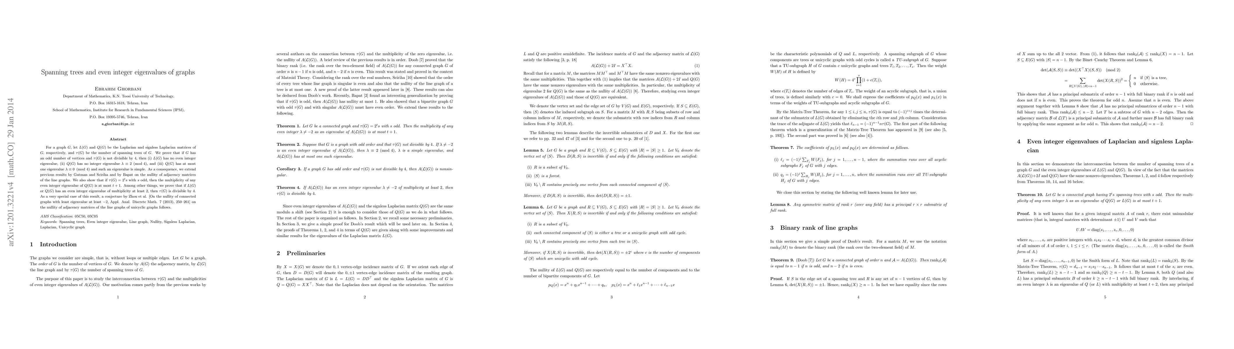 For a graph $G$, let $L(G)$ and $Q(G)$ be the Laplacian and signless Laplacian matrices of $G$, respectively, and $\tau(G)$ be the number of spanning trees of $G$. We prove that if $G$ has an odd number of vertices and $\tau(G)$ is not divisible by $4$, then (i) $L(G)$ has no even integer eigenvalue, (ii) $Q(G)$ has no integer eigenvalue $\lambda\equiv2\pmod4$, and (iii) $Q(G)$ has at most one eigenvalue $\lambda\equiv0\pmod4$ and such an eigenvalue is simple. As a consequence, we extend previous results by Gutman and Sciriha and by Bapat on the nullity of adjacency matrices of the line graphs. We also show that if $\tau(G)=2^ts$ with $s$ odd, then the multiplicity of any even integer eigenvalue of $Q(G)$ is at most $t+1$. Among other things, we prove that if $L(G)$ or $Q(G)$ has an even integer eigenvalue of multiplicity at least $2$, then $\tau(G)$ is divisible by $4$. As a very special case of this result, a conjecture by Zhou et al. [On the nullity of connected graphs with least eigenvalue at least $-2$, Appl. Anal. Discrete Math. 7 (2013), 250--261] on the nullity of adjacency matrices of the line graphs of unicyclic graphs follows.