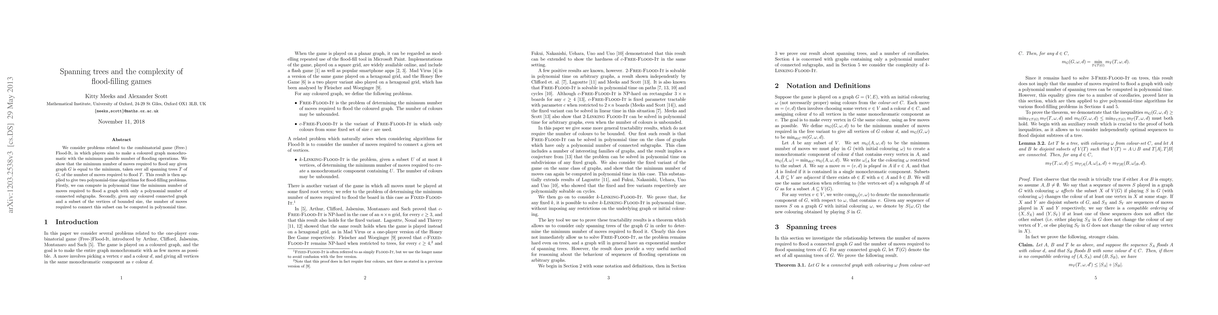This paper explores the combinatorial game Flood-It, demonstrating that the minimum moves to flood a graph G equals the minimum moves to flood any spanning tree T of G. It presents two polynomial-time algorithms: one for graphs with a polynomial number of connected subgraphs and another for computing the moves required to connect a subset of vertices.