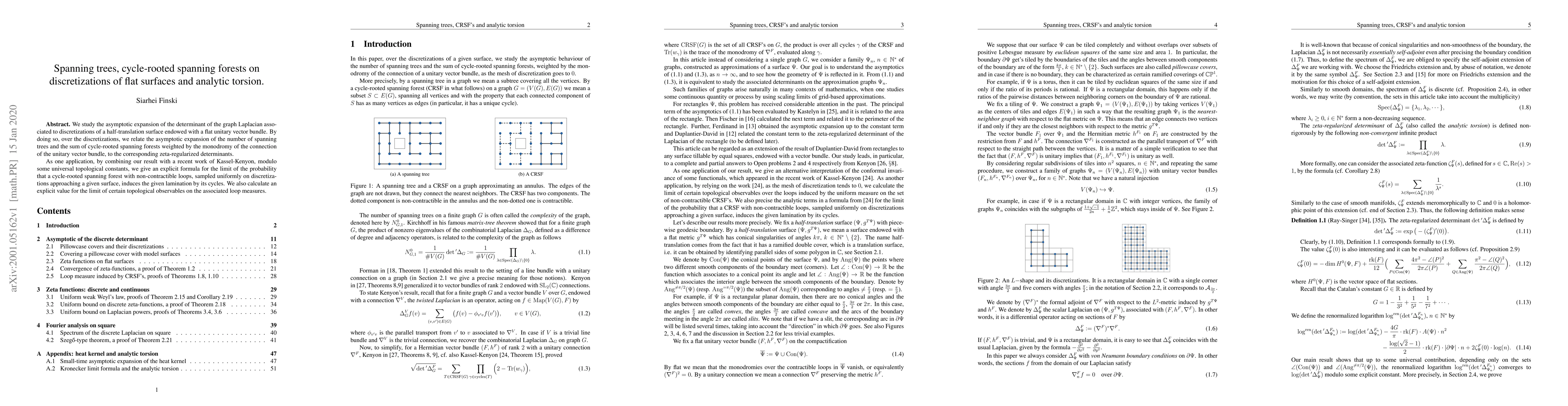 This paper investigates the asymptotic behavior of the determinant of the graph Laplacian on discretizations of flat surfaces, relating it to the number of spanning trees and cycle-rooted spanning forests. It provides an explicit formula for the probability of certain spanning forest configurations, and calculates limits of topological observables.