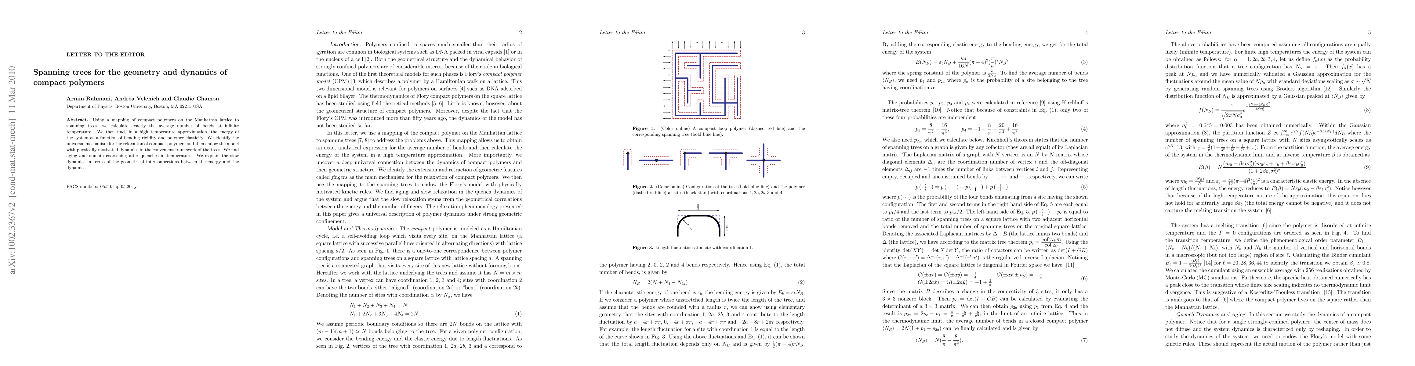 This paper maps compact polymers onto Manhattan lattice spanning trees to determine the average number of bends at infinite temperature and the system's energy based on bending rigidity and elasticity. It identifies a universal relaxation mechanism and explores aging and domain coarsening post-temperature quenches, linking slow dynamics to geometrical interconnections.
