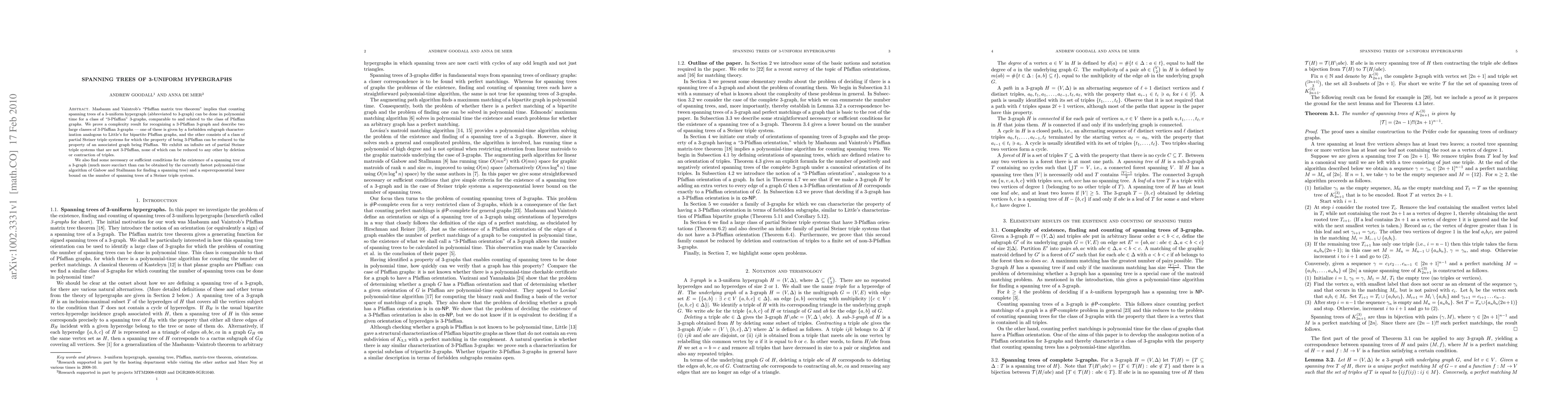 This paper explores the complexity of counting spanning trees in 3-uniform hypergraphs, proving that for "3-Pfaffian" 3-graphs, this can be done in polynomial time. It identifies two large classes of 3-Pfaffian 3-graphs and provides necessary or sufficient conditions for spanning tree existence, along with a superexponential lower bound for Steiner triple systems.