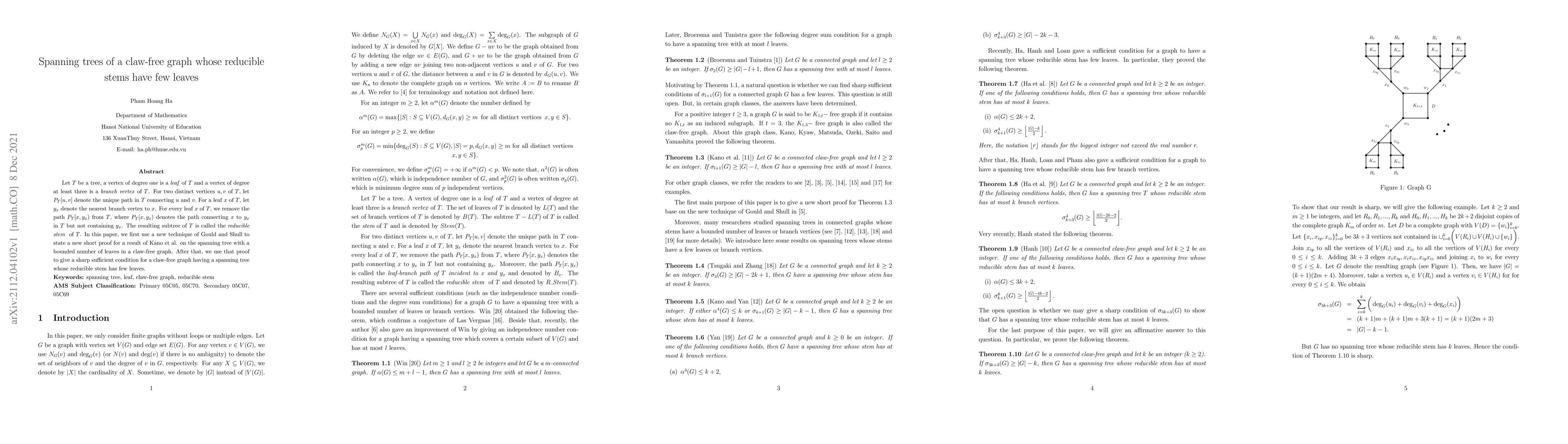 Let $T$ be a tree, a vertex of degree one is a leaf of $T$ and a vertex of degree at least three is a branch vertex of $T$. For two distinct vertices $u,v$ of $T$, let $P_T[u,v]$ denote the unique path in $T$ connecting $u$ and $v.$ For a leaf $x$ of $T$, let $y_x$ denote the nearest branch vertex to $x$. For every leaf $x$ of $T$, we remove the path $P_T [x, y_x)$ from $T$, where $P_T [x, y_x)$ denotes the path connecting $x$ to $y_x$ in $T$ but not containing $y_x$. The resulting subtree of $T$ is called the {\it reducible stem } of $T$. In this paper, we first use a new technique of Gould and Shull to state a new short proof for a result of Kano et al. on the spanning tree with a bounded number of leaves in a claw-free graph. After that, we use that proof to give a sharp sufficient condition for a claw-free graph having a spanning tree whose reducible stem has few leaves.