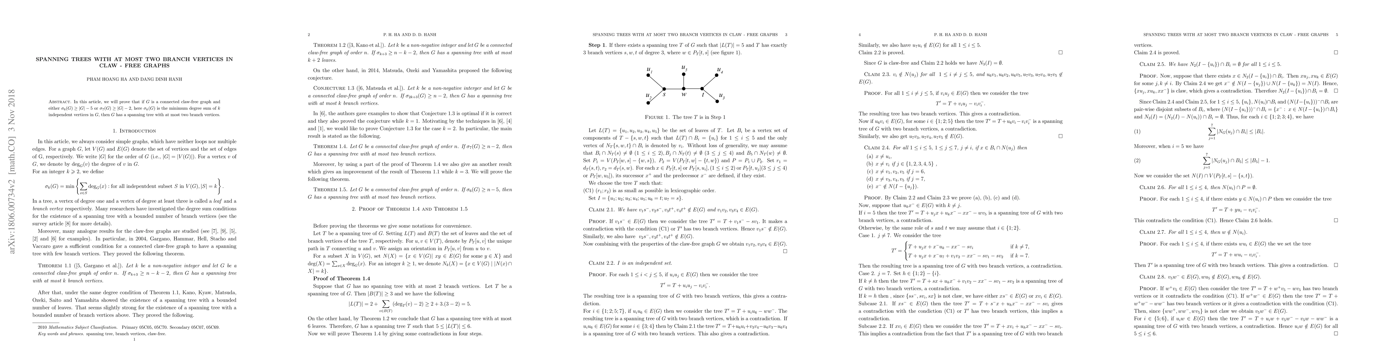 A connected claw-free graph has a spanning tree with at most 2 branch vertices if its minimum degree sum for independent sets of 6 or 7 vertices is high enough. This condition allows for the existence of such trees in claw-free graphs.
