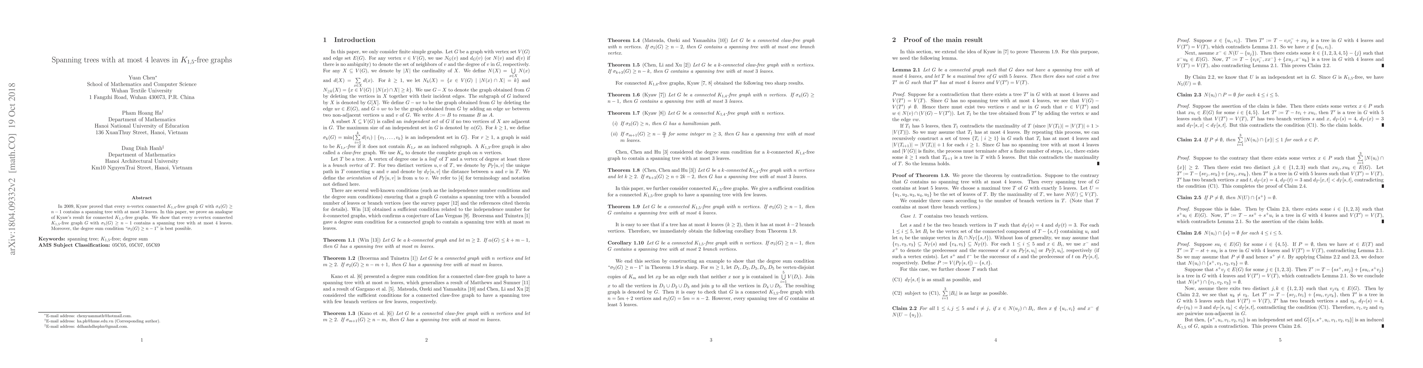 The paper presents a detailed proof showing that $K_{1,5}$-free graphs with a specific degree sum condition contain spanning trees with at most 4 leaves, extending earlier findings for $K_{1,4}$-free graphs.