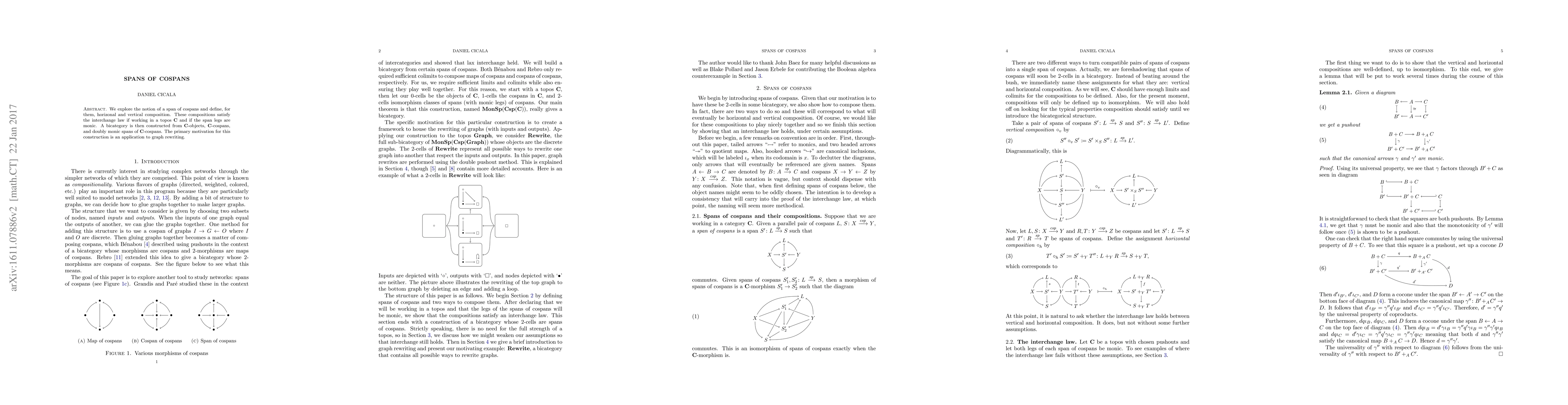 Summary: The paper introduces spans of cospans, defines their horizontal and vertical compositions, and constructs a bicategory from these structures, focusing on applications to graph rewriting when working in a topos with monic span legs.