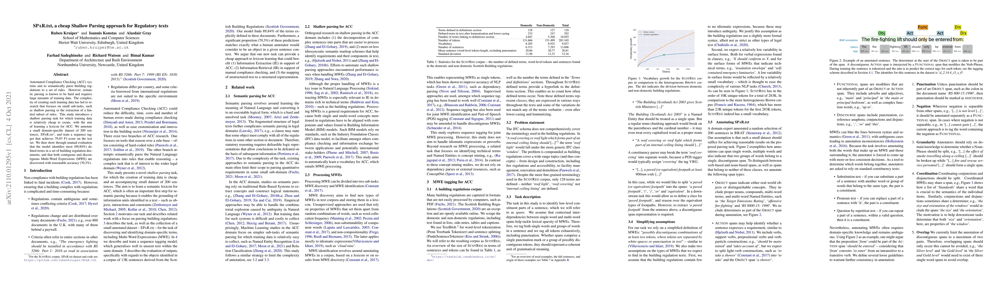 Automated Compliance Checking (ACC) systems aim to semantically parse building regulations to a set of rules. However, semantic parsing is known to be hard and requires large amounts of training data. The complexity of creating such training data has led to research that focuses on small sub-tasks, such as shallow parsing or the extraction of a limited subset of rules. This study introduces a shallow parsing task for which training data is relatively cheap to create, with the aim of learning a lexicon for ACC. We annotate a small domain-specific dataset of 200 sentences, SPaR.txt, and train a sequence tagger that achieves 79,93 F1-score on the test set. We then show through manual evaluation that the model identifies most (89,84%) defined terms in a set of building regulation documents, and that both contiguous and discontiguous Multi-Word Expressions (MWE) are discovered with reasonable accuracy (70,3%).