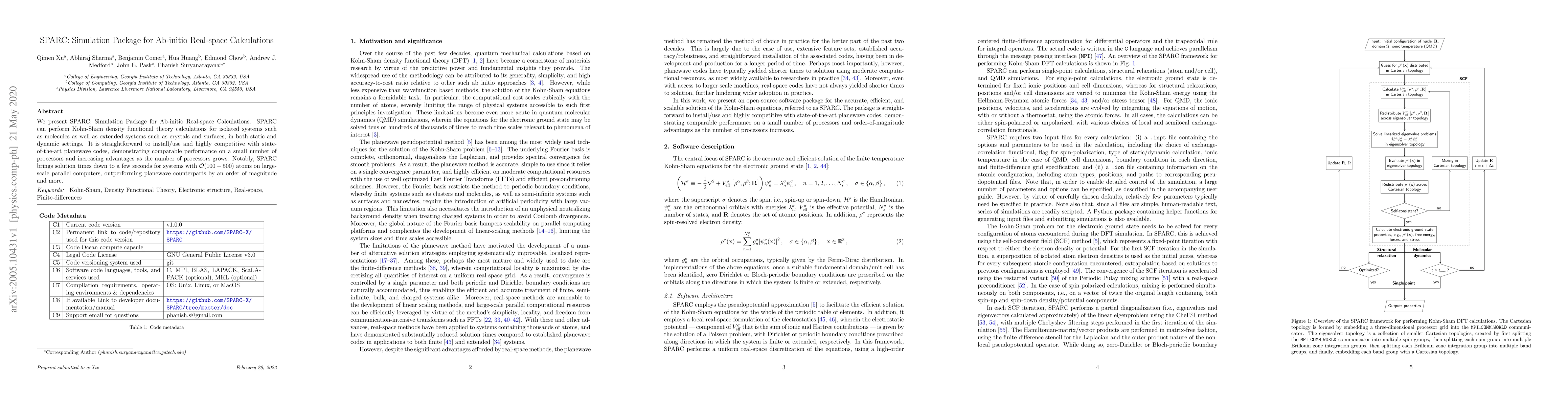 SPARC is a simulation package for ab-initio real-space calculations, capable of performing Kohn-Sham density functional theory calculations for both isolated systems like molecules and extended systems such as crystals and surfaces, in both static and dynamic settings.