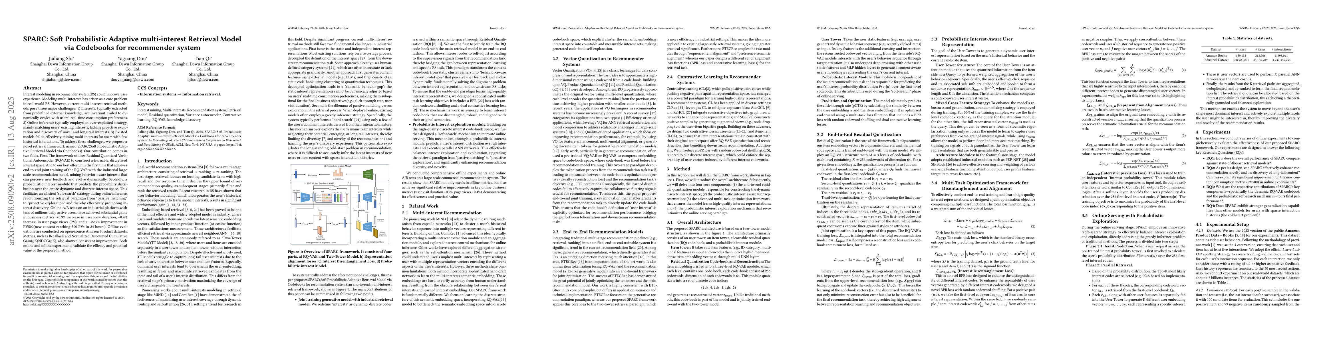 Modeling multi-interests has arisen as a core problem in real-world RS. Current multi-interest retrieval methods pose three major challenges: 1) Interests, typically extracted from predefined external knowledge, are invariant. Failed to dynamically evolve with users' real-time consumption preferences. 2) Online inference typically employs an over-exploited strategy, mainly matching users' existing interests, lacking proactive exploration and discovery of novel and long-tail interests. To address these challenges, we propose a novel retrieval framework named SPARC(Soft Probabilistic Adaptive Retrieval Model via Codebooks). Our contribution is two folds. First, the framework utilizes Residual Quantized Variational Autoencoder (RQ-VAE) to construct a discretized interest space. It achieves joint training of the RQ-VAE with the industrial large scale recommendation model, mining behavior-aware interests that can perceive user feedback and evolve dynamically. Secondly, a probabilistic interest module that predicts the probability distribution over the entire dynamic and discrete interest space. This facilitates an efficient "soft-search" strategy during online inference, revolutionizing the retrieval paradigm from "passive matching" to "proactive exploration" and thereby effectively promoting interest discovery. Online A/B tests on an industrial platform with tens of millions daily active users, have achieved substantial gains in business metrics: +0.9% increase in user view duration, +0.4% increase in user page views (PV), and a +22.7% improvement in PV500(new content reaching 500 PVs in 24 hours). Offline evaluations are conducted on open-source Amazon Product datasets. Metrics, such as Recall@K and Normalized Discounted Cumulative Gain@K(NDCG@K), also showed consistent improvement. Both online and offline experiments validate the efficacy and practical value of the proposed method.