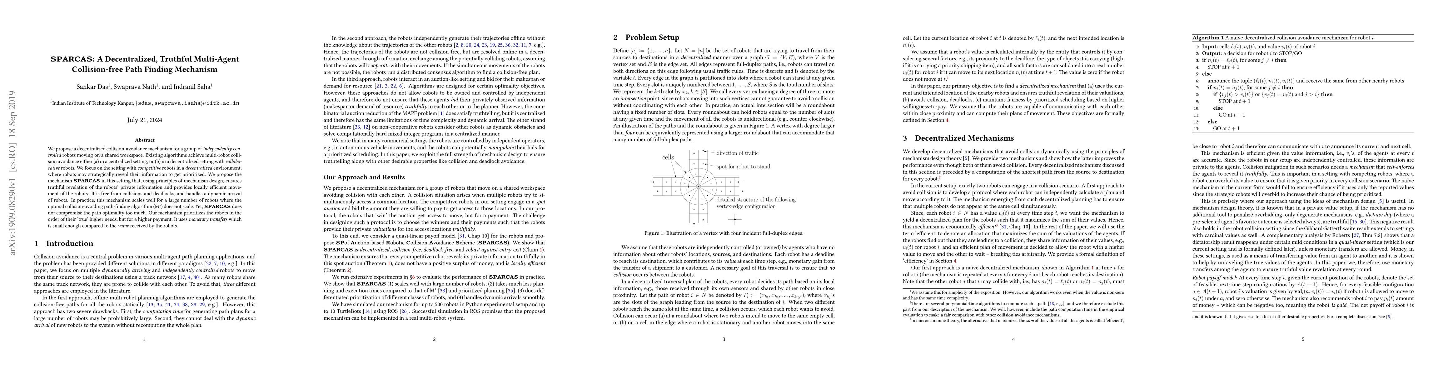 We propose a decentralized collision-avoidance mechanism for a group of independently controlled robots moving on a shared workspace. Existing algorithms achieve multi-robot collision avoidance either (a) in a centralized setting, or (b) in a decentralized setting with collaborative robots. We focus on the setting with competitive robots in a decentralized environment, where robots may strategically reveal their information to get prioritized. We propose the mechanism SPARCAS in this setting that, using principles of mechanism design, ensures truthful revelation of the robots' private information and provides locally efficient movement of the robots. It is free from collisions and deadlocks, and handles a dynamic arrival of robots. In practice, this mechanism scales well for a large number of robots where the optimal collision-avoiding path-finding algorithm (M*) does not scale. Yet, SPARCAS does not compromise the path optimality too much. Our mechanism prioritizes the robots in the order of their `true' higher needs, but for a higher payment. It uses monetary transfers which is small enough compared to the value received by the robots.