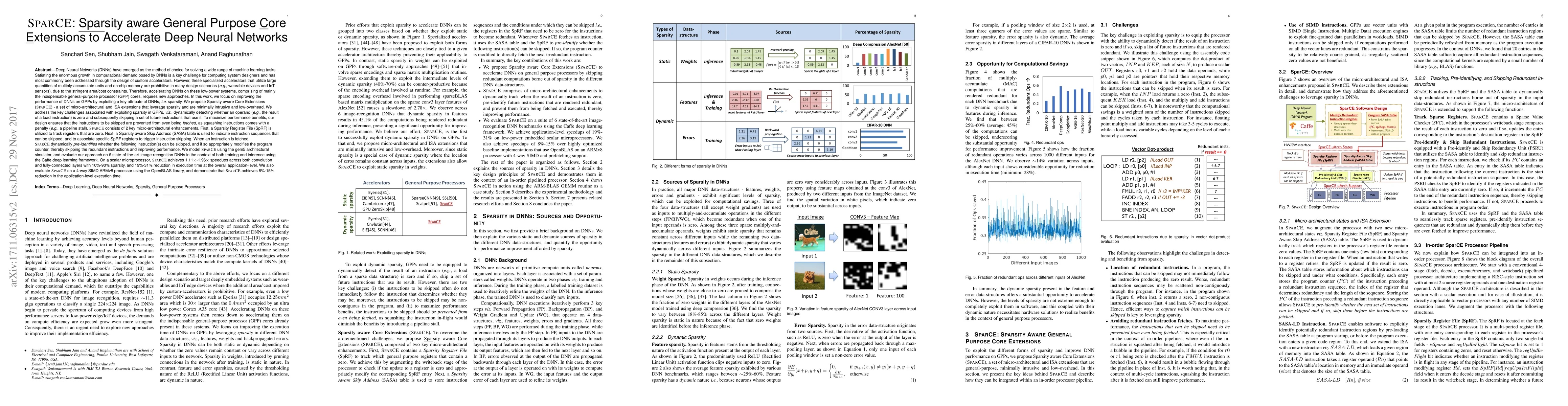 The paper proposes SparCE, a set of micro-architectural and ISA extensions to accelerate deep neural networks (DNNs) on general-purpose processor cores by exploiting sparsity. SparCE dynamically detects zero operands and skips redundant instructions, achieving 19%-31% reduction in execution time on scalar processors and 8%-15% on SIMD ARMv8 processors.