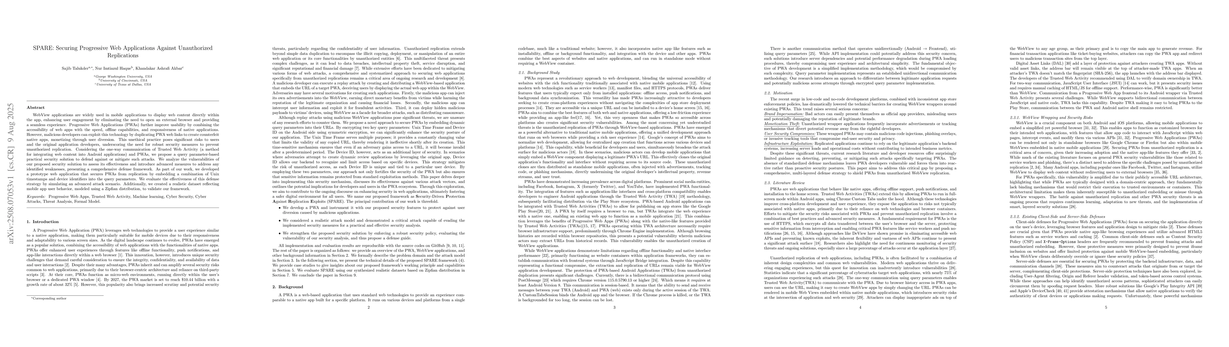 The paper introduces SPARE, a query parameter-based security solution that defends PWAs against unauthorized replication by embedding Unix timestamps and device identifiers into query parameters, along with an enhanced mechanism incorporating device IDs and a request threshold to counter advanced attack vectors.
