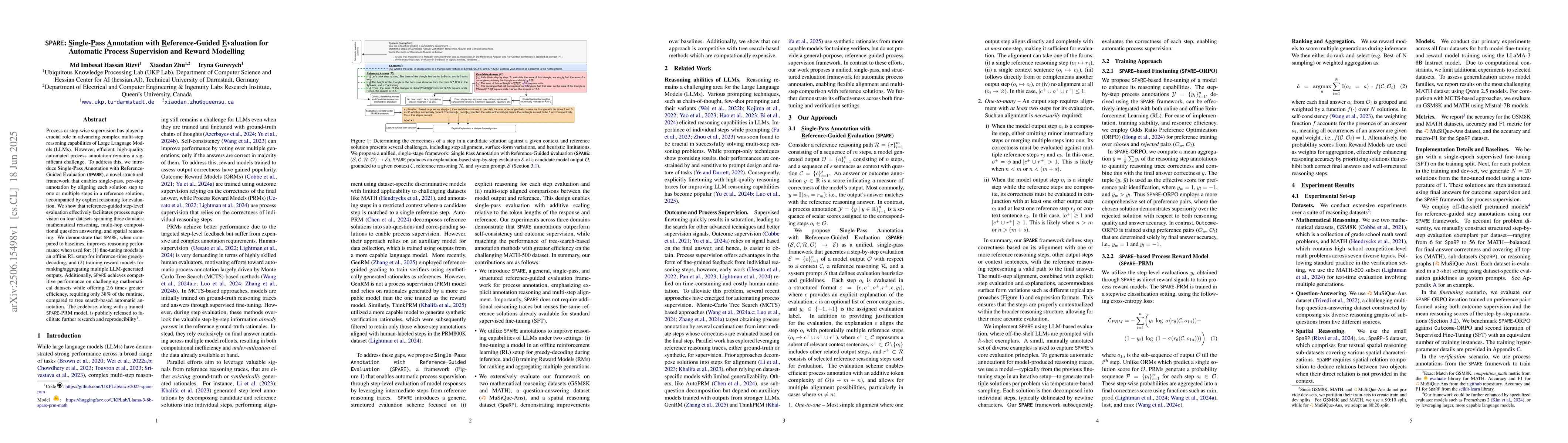 Process or step-wise supervision has played a crucial role in advancing complex multi-step reasoning capabilities of Large Language Models (LLMs). However, efficient, high-quality automated process annotation remains a significant challenge. To address this, we introduce Single-Pass Annotation with Reference-Guided Evaluation (SPARE), a novel structured framework that enables single-pass, per-step annotation by aligning each solution step to one or multiple steps in a reference solution, accompanied by explicit reasoning for evaluation. We show that reference-guided step-level evaluation effectively facilitates process supervision on four datasets spanning three domains: mathematical reasoning, multi-hop compositional question answering, and spatial reasoning. We demonstrate that SPARE, when compared to baselines, improves reasoning performance when used for: (1) fine-tuning models in an offline RL setup for inference-time greedy-decoding, and (2) training reward models for ranking/aggregating multiple LLM-generated outputs. Additionally, SPARE achieves competitive performance on challenging mathematical datasets while offering 2.6 times greater efficiency, requiring only 38% of the runtime, compared to tree search-based automatic annotation. The codebase, along with a trained SPARE-PRM model, is publicly released to facilitate further research and reproducibility.