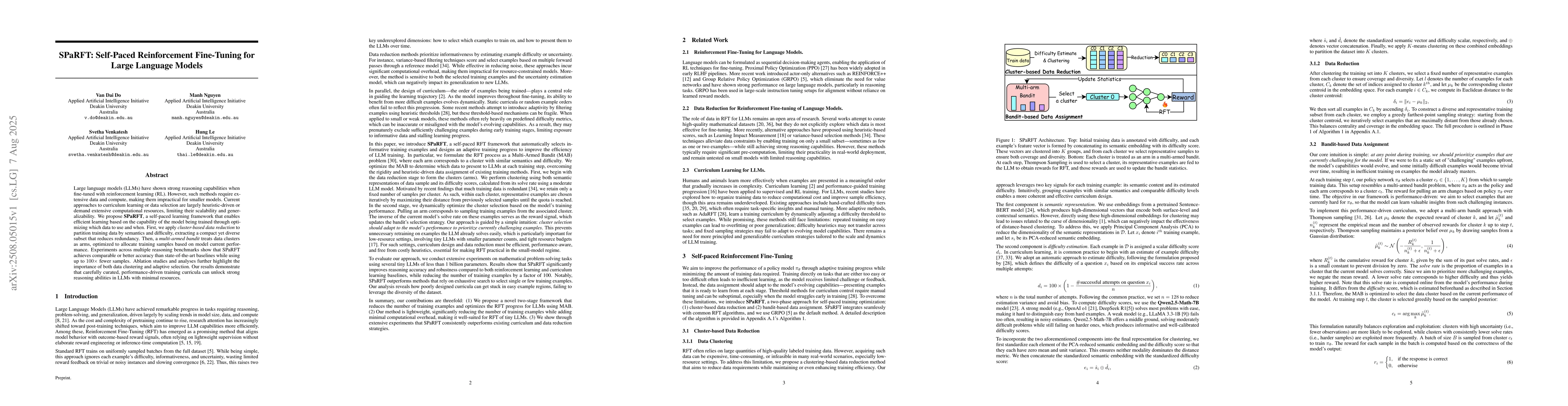 Large language models (LLMs) have shown strong reasoning capabilities when fine-tuned with reinforcement learning (RL). However, such methods require extensive data and compute, making them impractical for smaller models. Current approaches to curriculum learning or data selection are largely heuristic-driven or demand extensive computational resources, limiting their scalability and generalizability. We propose \textbf{SPaRFT}, a self-paced learning framework that enables efficient learning based on the capability of the model being trained through optimizing which data to use and when. First, we apply \emph{cluster-based data reduction} to partition training data by semantics and difficulty, extracting a compact yet diverse subset that reduces redundancy. Then, a \emph{multi-armed bandit} treats data clusters as arms, optimized to allocate training samples based on model current performance. Experiments across multiple reasoning benchmarks show that SPaRFT achieves comparable or better accuracy than state-of-the-art baselines while using up to \(100\times\) fewer samples. Ablation studies and analyses further highlight the importance of both data clustering and adaptive selection. Our results demonstrate that carefully curated, performance-driven training curricula can unlock strong reasoning abilities in LLMs with minimal resources.