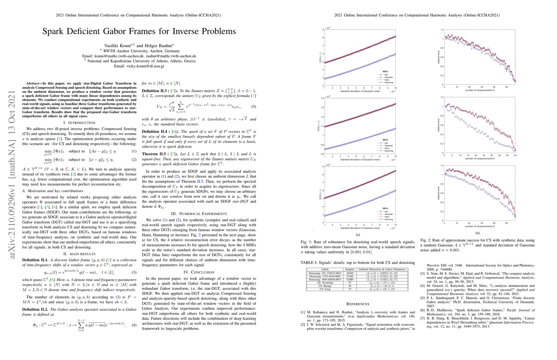 This paper proposes a star-Digital Gabor Transform to enhance Compressed Sensing and speech denoising. The method generates spark deficient Gabor frames with linear dependencies, outperforming three state-of-the-art Gabor transforms in both synthetic and real-world signal experiments.