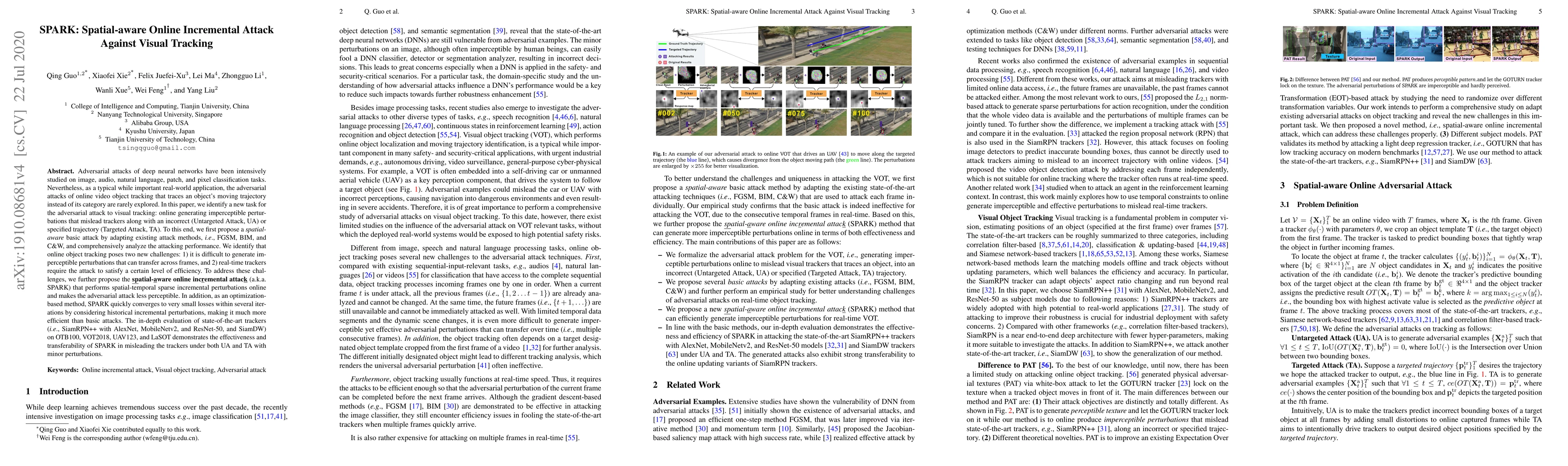 This paper introduces SPARK, a spatial-aware online incremental attack method for visual object tracking, addressing the challenges of generating imperceptible, transferrable perturbations across frames and maintaining real-time efficiency. SPARK outperforms basic attacks by leveraging historical incremental perturbations for faster convergence and minimal loss, effectively misleading trackers in both untargeted and targeted attacks.