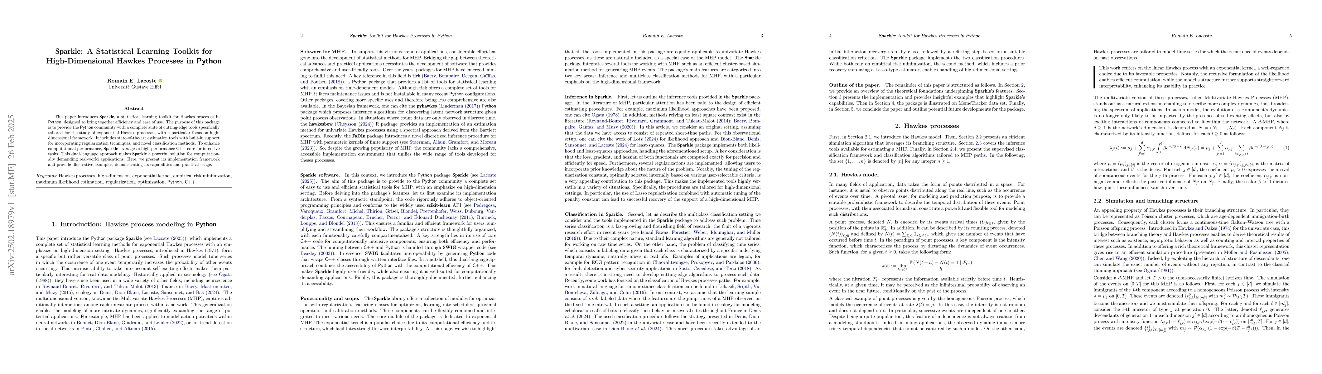 The paper introduces Sparkle, a Python toolkit for statistical learning of high-dimensional Hawkes processes, combining efficiency and ease of use. It offers state-of-the-art estimation tools with regularization support and novel classification methods, leveraging a high-performance C++ core for computational efficiency.