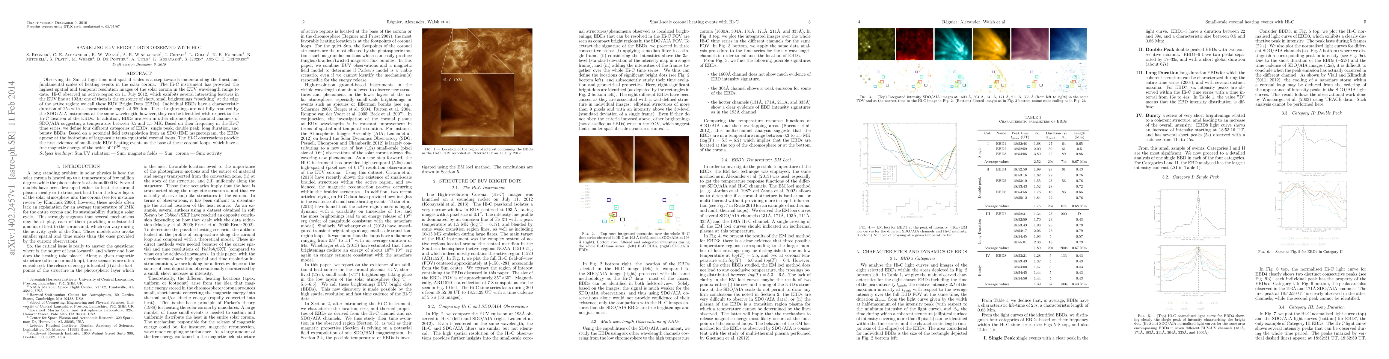 Observing the Sun at high time and spatial scales is a step towards understanding the finest and fundamental scales of heating events in the solar corona. The Hi-C instrument has provided the highest spatial and temporal resolution images of the solar corona in the EUV wavelength range to date. Hi-C observed an active region on 11 July 2012, which exhibits several interesting features in the EUV line at 193\AA: one of them is the existence of short, small brightenings ``sparkling" at the edge of the active region; we call these EUV Bright Dots (EBDs). Individual EBDs have a characteristic duration of 25s with a characteristic length of 680 km. These brightenings are not fully resolved by the SDO/AIA instrument at the same wavelength, however, they can be identified with respect to the Hi-C location of the EBDs. In addition, EBDs are seen in other chromospheric/coronal channels of SDO/AIA suggesting a temperature between 0.5 and 1.5 MK. Based on their frequency in the Hi-C time series, we define four different categories of EBDs: single peak, double peak, long duration, and bursty EBDs. Based on a potential field extrapolation from an SDO/HMI magnetogram, the EBDs appear at the footpoints of large-scale trans-equatorial coronal loops. The Hi-C observations provide the first evidence of small-scale EUV heating events at the base of these coronal loops, which have a free magnetic energy of the order of 10$^{26}$ erg.