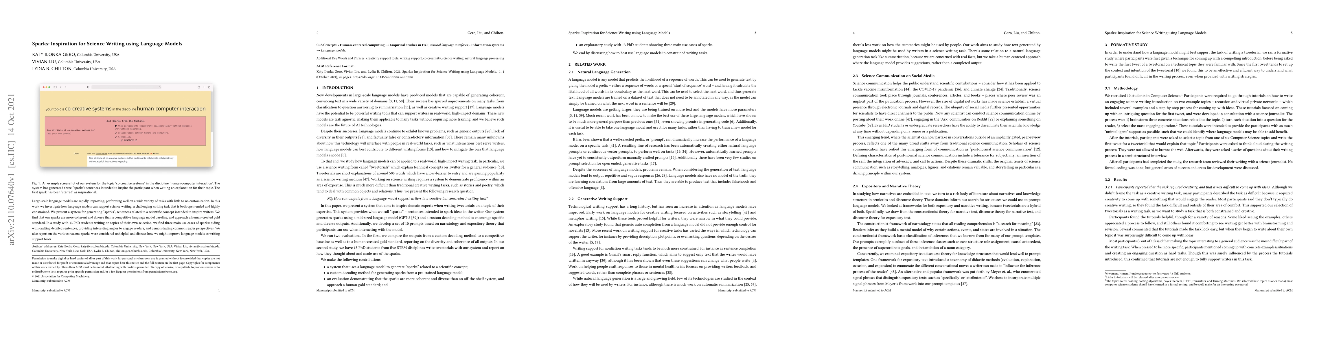 Large-scale language models are rapidly improving, performing well on a wide variety of tasks with little to no customization. In this work we investigate how language models can support science writing, a challenging writing task that is both open-ended and highly constrained. We present a system for generating "sparks", sentences related to a scientific concept intended to inspire writers. We find that our sparks are more coherent and diverse than a competitive language model baseline, and approach a human-created gold standard. In a study with 13 PhD students writing on topics of their own selection, we find three main use cases of sparks: aiding with crafting detailed sentences, providing interesting angles to engage readers, and demonstrating common reader perspectives. We also report on the various reasons sparks were considered unhelpful, and discuss how we might improve language models as writing support tools.