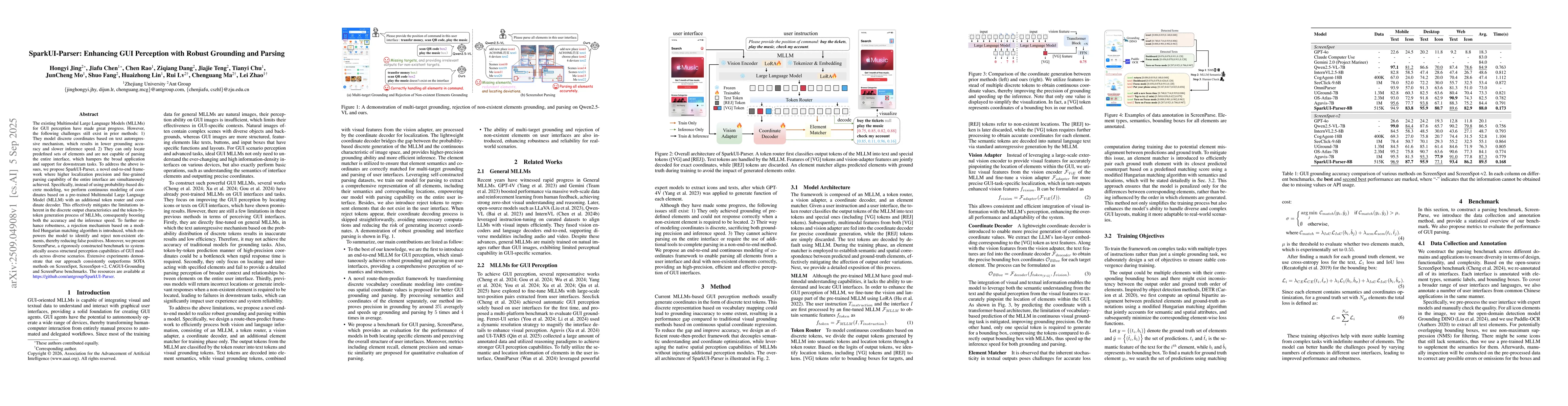 The existing Multimodal Large Language Models (MLLMs) for GUI perception have made great progress. However, the following challenges still exist in prior methods: 1) They model discrete coordinates based on text autoregressive mechanism, which results in lower grounding accuracy and slower inference speed. 2) They can only locate predefined sets of elements and are not capable of parsing the entire interface, which hampers the broad application and support for downstream tasks. To address the above issues, we propose SparkUI-Parser, a novel end-to-end framework where higher localization precision and fine-grained parsing capability of the entire interface are simultaneously achieved. Specifically, instead of using probability-based discrete modeling, we perform continuous modeling of coordinates based on a pre-trained Multimodal Large Language Model (MLLM) with an additional token router and coordinate decoder. This effectively mitigates the limitations inherent in the discrete output characteristics and the token-by-token generation process of MLLMs, consequently boosting both the accuracy and the inference speed. To further enhance robustness, a rejection mechanism based on a modified Hungarian matching algorithm is introduced, which empowers the model to identify and reject non-existent elements, thereby reducing false positives. Moreover, we present ScreenParse, a rigorously constructed benchmark to systematically assess structural perception capabilities of GUI models across diverse scenarios. Extensive experiments demonstrate that our approach consistently outperforms SOTA methods on ScreenSpot, ScreenSpot-v2, CAGUI-Grounding and ScreenParse benchmarks. The resources are available at https://github.com/antgroup/SparkUI-Parser.