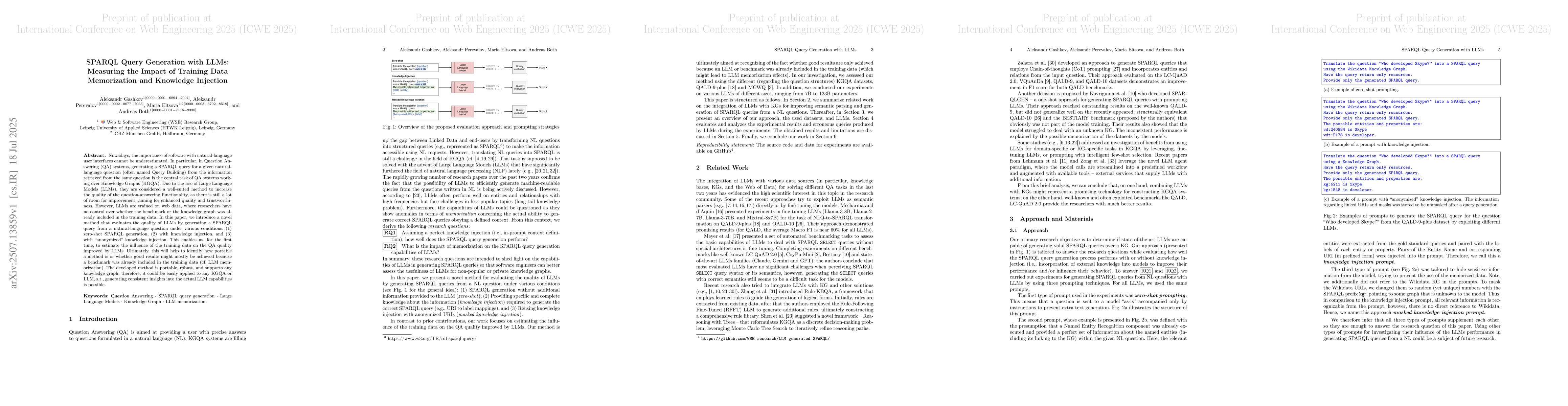 Nowadays, the importance of software with natural-language user interfaces cannot be underestimated. In particular, in Question Answering (QA) systems, generating a SPARQL query for a given natural-language question (often named Query Building) from the information retrieved from the same question is the central task of QA systems working over Knowledge Graphs (KGQA). Due to the rise of Large Language Models (LLMs), they are considered a well-suited method to increase the quality of the question-answering functionality, as there is still a lot of room for improvement, aiming for enhanced quality and trustworthiness. However, LLMs are trained on web data, where researchers have no control over whether the benchmark or the knowledge graph was already included in the training data. In this paper, we introduce a novel method that evaluates the quality of LLMs by generating a SPARQL query from a natural-language question under various conditions: (1) zero-shot SPARQL generation, (2) with knowledge injection, and (3) with "anonymized" knowledge injection. This enables us, for the first time, to estimate the influence of the training data on the QA quality improved by LLMs. Ultimately, this will help to identify how portable a method is or whether good results might mostly be achieved because a benchmark was already included in the training data (cf. LLM memorization). The developed method is portable, robust, and supports any knowledge graph; therefore, it could be easily applied to any KGQA or LLM, s.t., generating consistent insights into the actual LLM capabilities is possible.