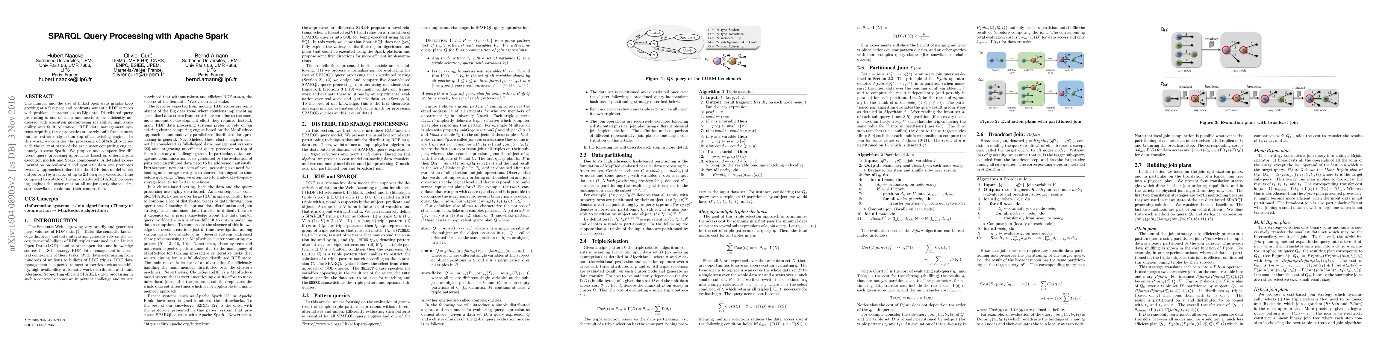 This paper explores efficient SPARQL query processing using Apache Spark to handle large linked open data sets. It proposes and evaluates five query processing approaches, demonstrating that two RDF-tailored methods outperform others across various query shapes, emphasizing scalability and performance in big data environments.