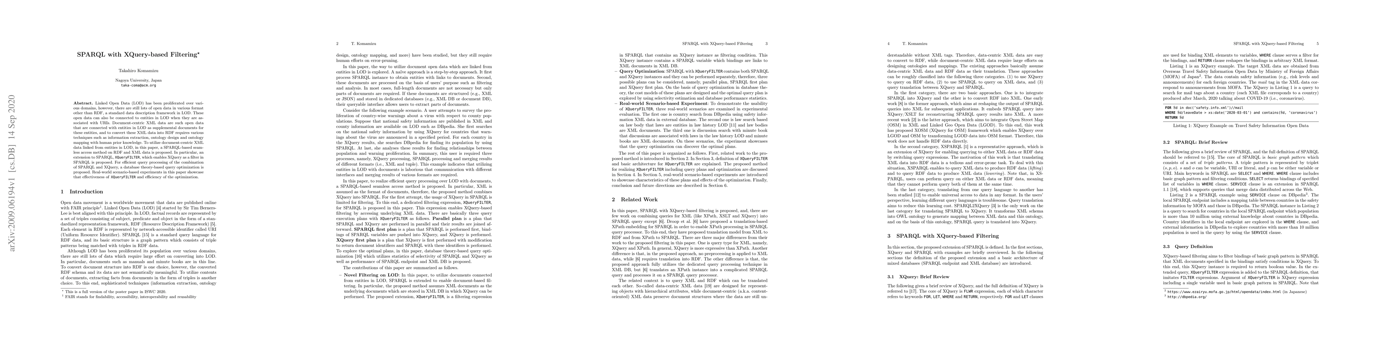 Linked Open Data (LOD) has been proliferated over various domains, however, there are still lots of open data in various format other than RDF, a standard data description framework in LOD. These open data can also be connected to entities in LOD when they are associated with URIs. Document-centric XML data are such open data that are connected with entities in LOD as supplemental documents for these entities, and to convert these XML data into RDF requires various techniques such as information extraction, ontology design and ontology mapping with human prior knowledge. To utilize document-centric XML data linked from entities in LOD, in this paper, a SPARQL-based seamless access method on RDF and XML data is proposed. In particular, an extension to SPARQL, XQueryFILTER, which enables XQuery as a filter in SPARQL is proposed. For efficient query processing of the combination of SPARQL and XQuery, a database theory-based query optimization is proposed. Real-world scenario-based experiments in this paper showcase that effectiveness of XQueryFILTER and efficiency of the optimization.