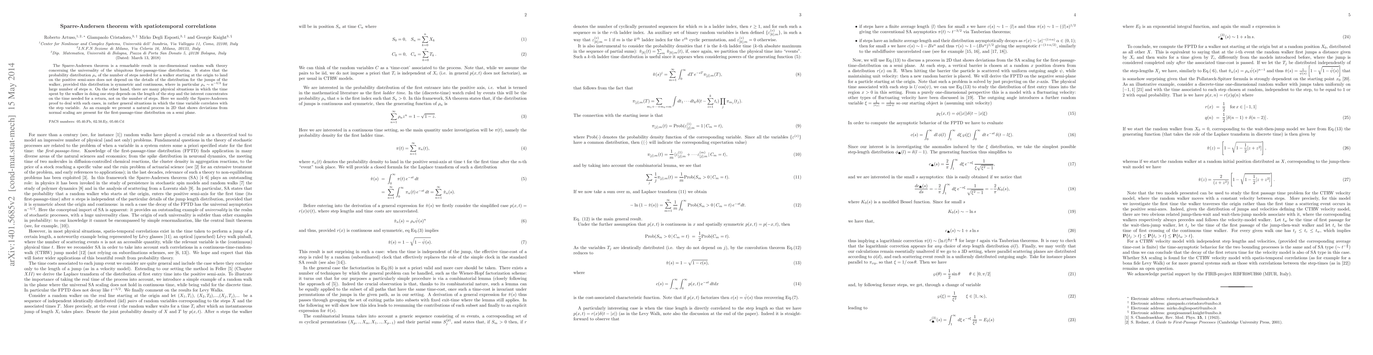 This paper extends the Sparre-Andersen theorem to account for spatiotemporal correlations in random walks, showing that the first-passage-time distribution deviates from normal scaling in certain physical processes. The modified proof addresses scenarios where step time depends on step length.
