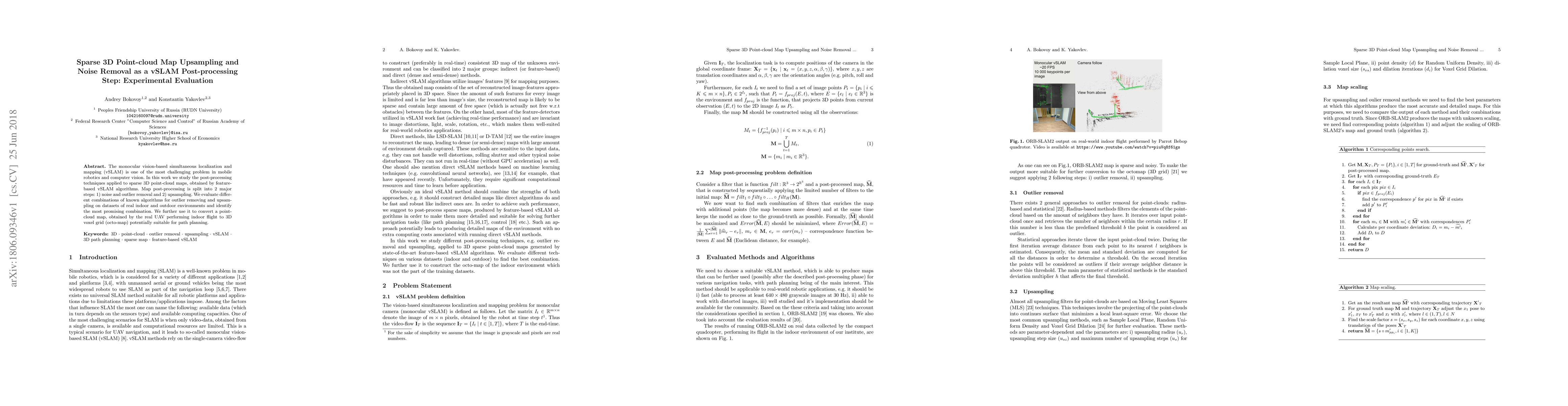 The monocular vision-based simultaneous localization and mapping (vSLAM) is one of the most challenging problem in mobile robotics and computer vision. In this work we study the post-processing techniques applied to sparse 3D point-cloud maps, obtained by feature-based vSLAM algorithms. Map post-processing is split into 2 major steps: 1) noise and outlier removal and 2) upsampling. We evaluate different combinations of known algorithms for outlier removing and upsampling on datasets of real indoor and outdoor environments and identify the most promising combination. We further use it to convert a point-cloud map, obtained by the real UAV performing indoor flight to 3D voxel grid (octo-map) potentially suitable for path planning.