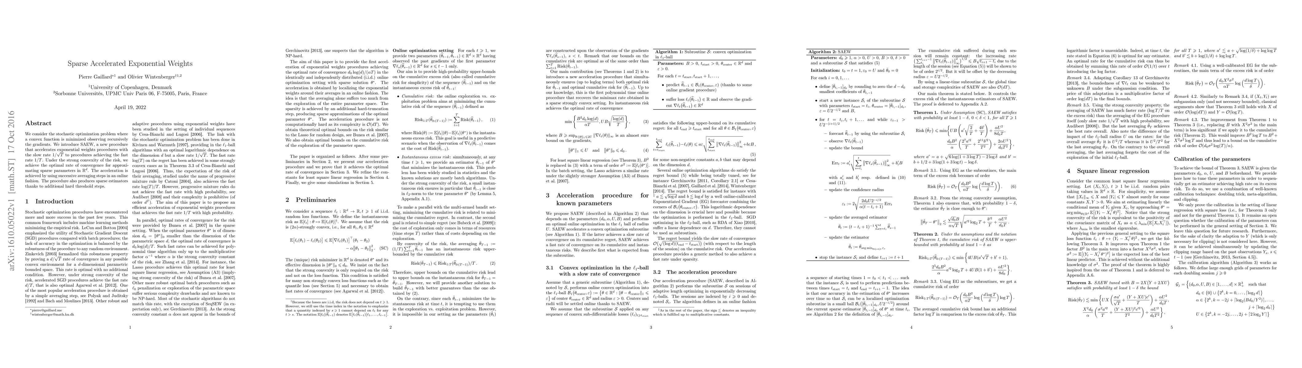 This paper introduces SAEW, a novel accelerated exponential weights procedure for stochastic optimization, achieving a convergence rate of $1/T$ instead of $1/\sqrt{T}$, optimal under strong convexity. It employs successive averaging and hard thresholding to produce sparse parameter estimators.