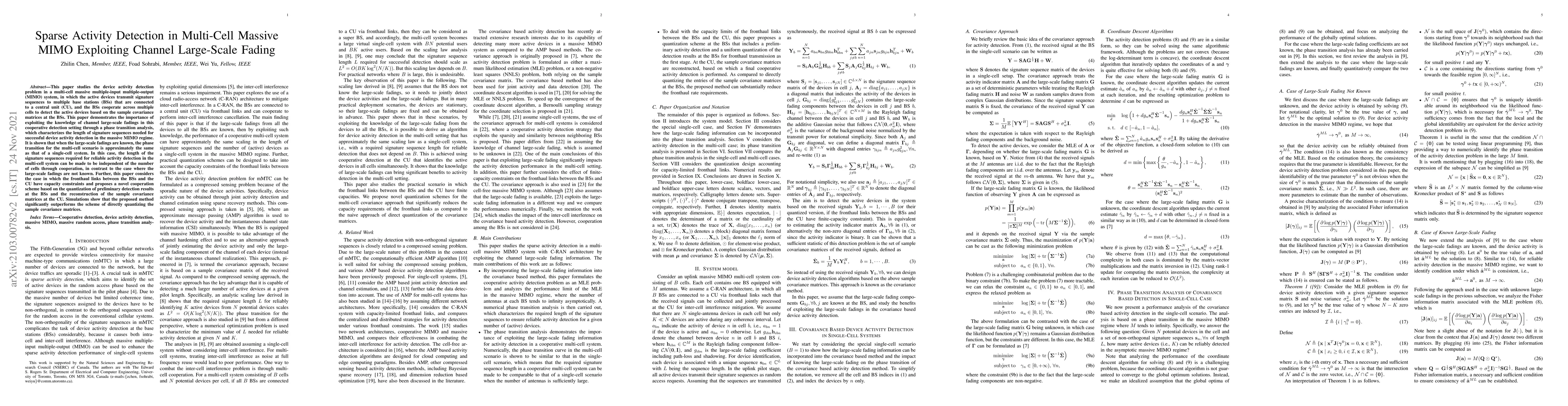 This paper investigates device activity detection in multi-cell massive MIMO systems using cooperative detection across base stations, emphasizing the role of channel large-scale fading knowledge. It proposes a novel cooperation scheme to handle fronthaul capacity constraints, demonstrating improved performance over direct covariance matrix quantization.