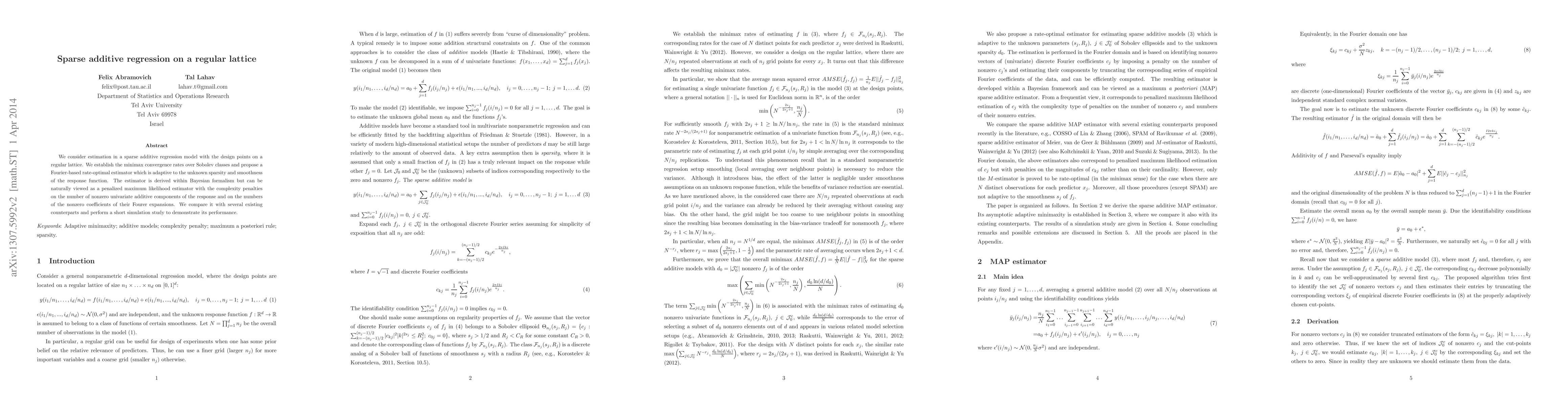 We consider estimation in a sparse additive regression model with the design points on a regular lattice. We establish the minimax convergence rates over Sobolev classes and propose a Fourier-based rate-optimal estimator which is adaptive to the unknown sparsity and smoothness of the response function. The estimator is derived within Bayesian formalism but can be naturally viewed as a penalized maximum likelihood estimator with the complexity penalties on the number of nonzero univariate additive components of the response and on the numbers of the nonzero coefficients of their Fourer expansions. We compare it with several existing counterparts and perform a short simulation study to demonstrate its performance.