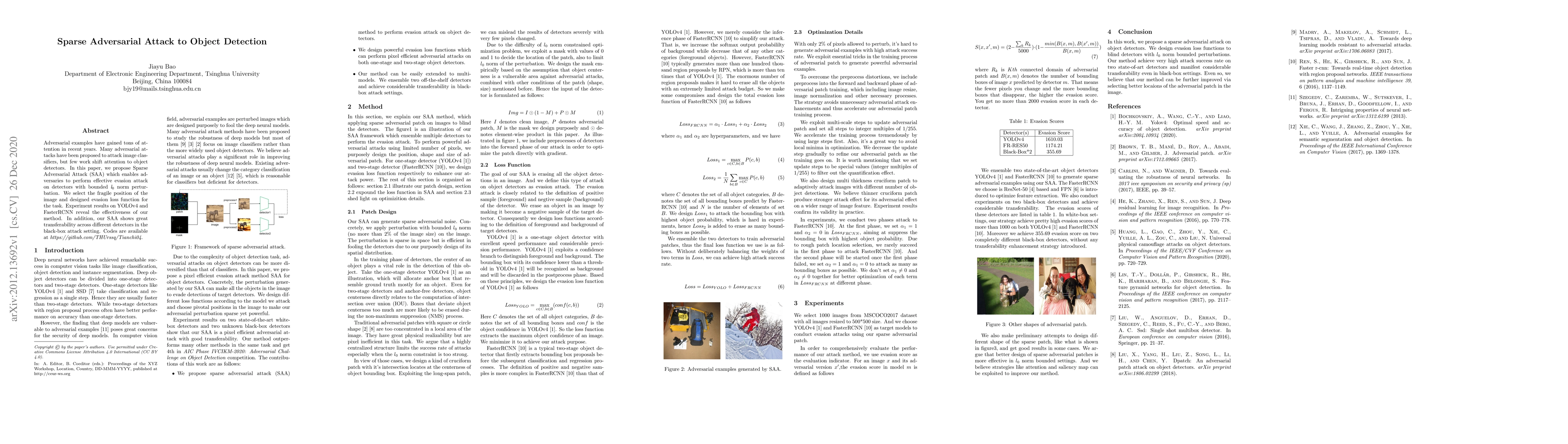 Adversarial examples have gained tons of attention in recent years. Many adversarial attacks have been proposed to attack image classifiers, but few work shift attention to object detectors. In this paper, we propose Sparse Adversarial Attack (SAA) which enables adversaries to perform effective evasion attack on detectors with bounded \emph{l$_{0}$} norm perturbation. We select the fragile position of the image and designed evasion loss function for the task. Experiment results on YOLOv4 and FasterRCNN reveal the effectiveness of our method. In addition, our SAA shows great transferability across different detectors in the black-box attack setting. Codes are available at \emph{https://github.com/THUrssq/Tianchi04}.
