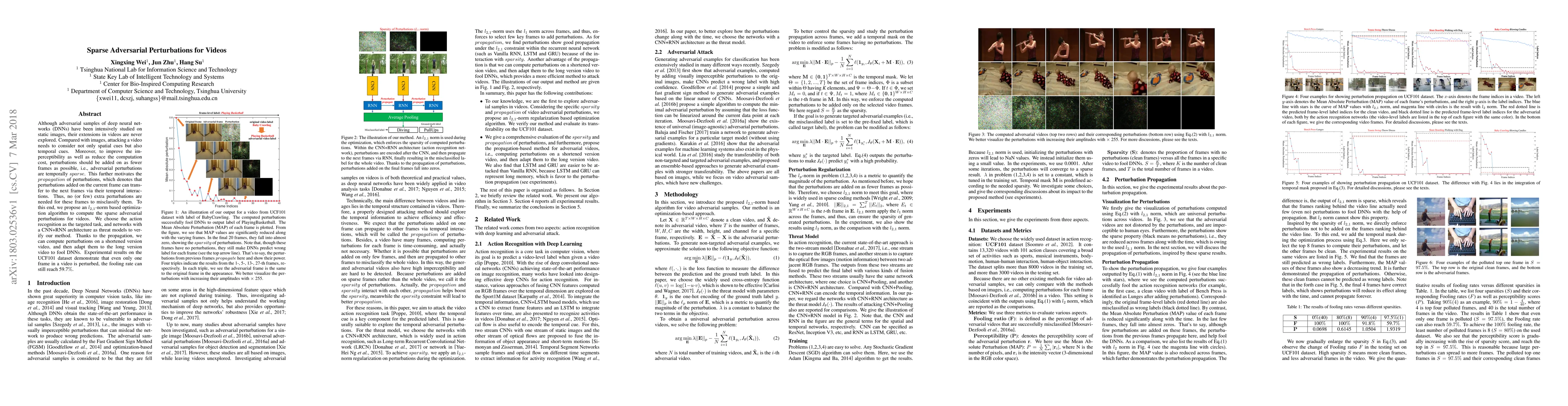 Although adversarial samples of deep neural networks (DNNs) have been intensively studied on static images, their extensions in videos are never explored. Compared with images, attacking a video needs to consider not only spatial cues but also temporal cues. Moreover, to improve the imperceptibility as well as reduce the computation cost, perturbations should be added on as fewer frames as possible, i.e., adversarial perturbations are temporally sparse. This further motivates the propagation of perturbations, which denotes that perturbations added on the current frame can transfer to the next frames via their temporal interactions. Thus, no (or few) extra perturbations are needed for these frames to misclassify them. To this end, we propose an l2,1-norm based optimization algorithm to compute the sparse adversarial perturbations for videos. We choose the action recognition as the targeted task, and networks with a CNN+RNN architecture as threat models to verify our method. Thanks to the propagation, we can compute perturbations on a shortened version video, and then adapt them to the long version video to fool DNNs. Experimental results on the UCF101 dataset demonstrate that even only one frame in a video is perturbed, the fooling rate can still reach 59.7%.