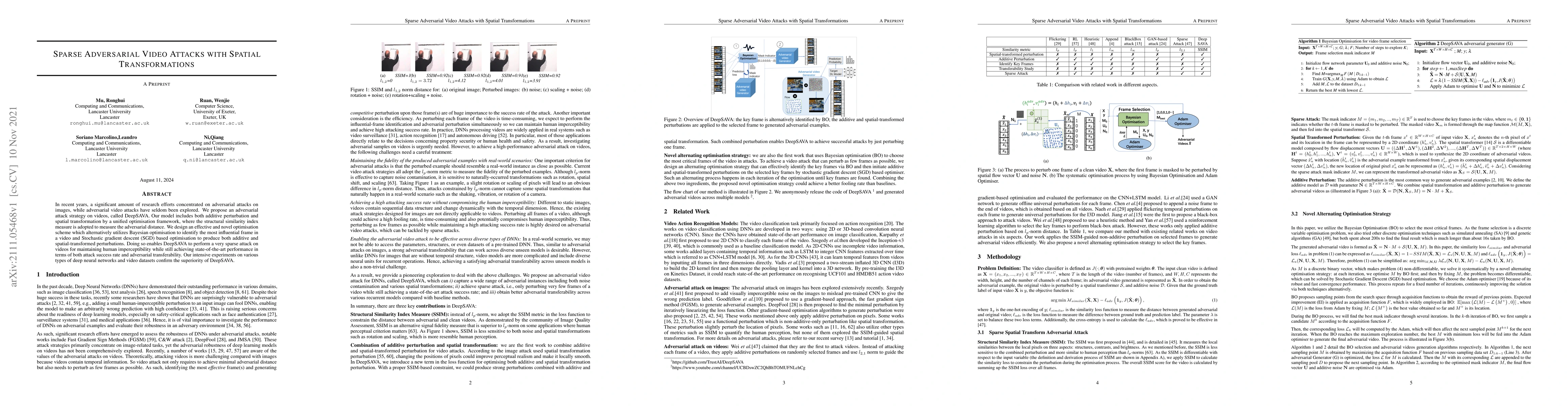This paper proposes DeepSAVA, an adversarial attack strategy for videos that combines additive perturbations and spatial transformations within a unified optimization framework. The method employs Bayesian optimization to identify key frames and SGD for generating sparse, imperceptible perturbations, achieving high attack success rates and transferability.