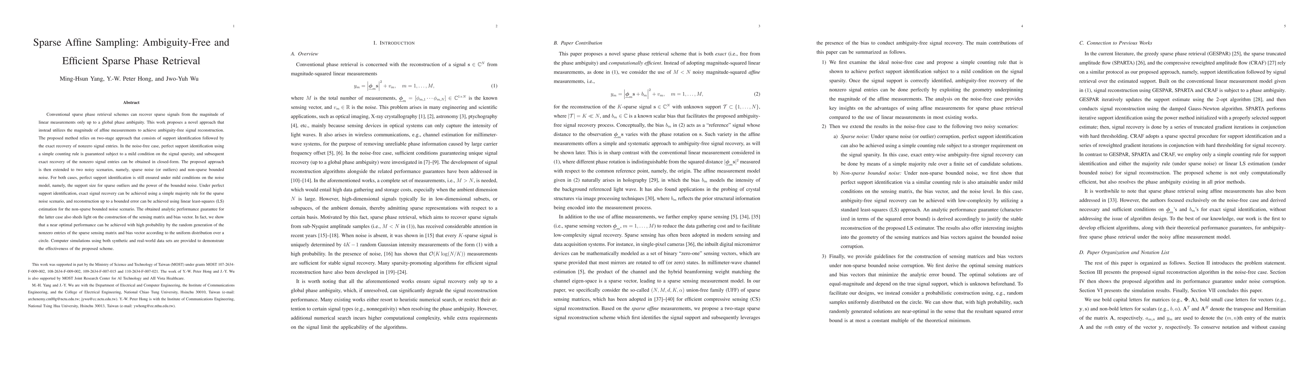 A new method for sparse phase retrieval achieves ambiguity-free signal reconstruction using affine measurements, offering perfect support identification and exact recovery in noise-free cases, with near-optimal performance achievable through random sensing matrix generation.