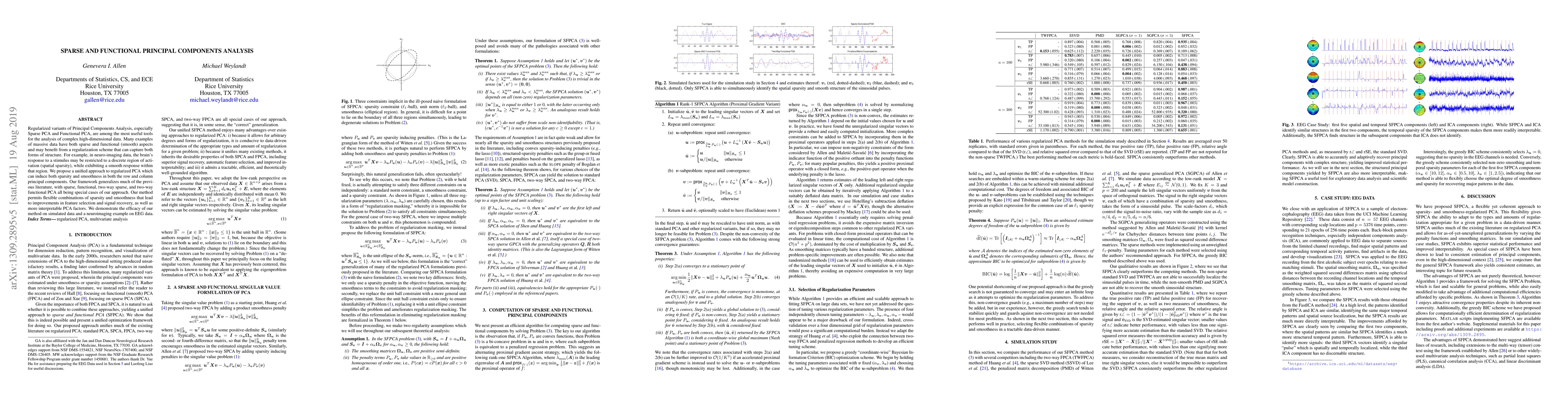 This paper proposes a unified approach for regularized PCA that can induce both sparsity and smoothness in principal components, generalizing previous methods. The method improves feature selection and signal recovery, and is demonstrated on simulated data and EEG neuroimaging data.