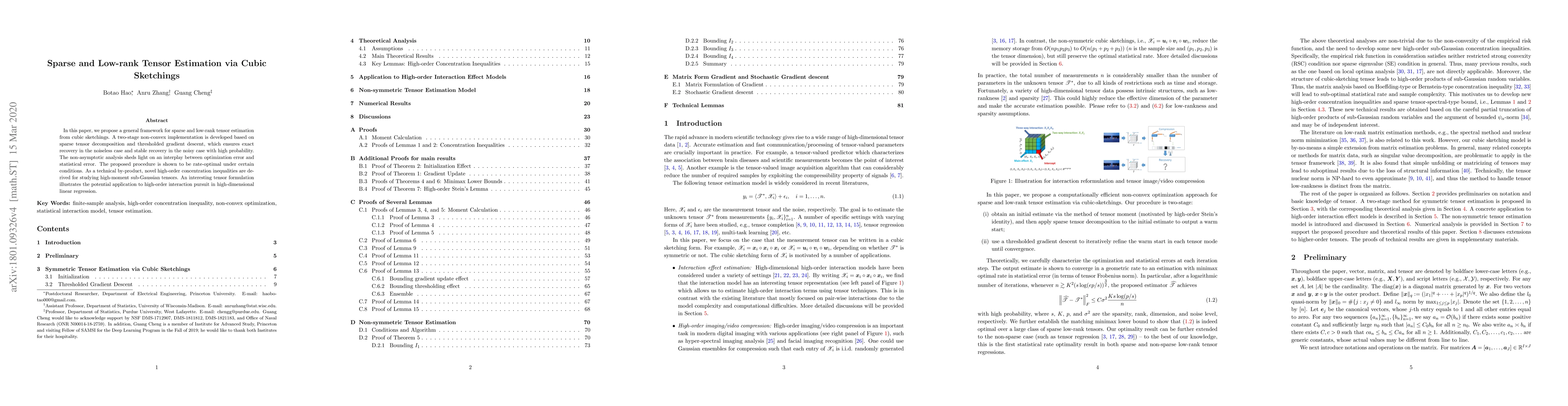 This paper introduces a framework for estimating sparse and low-rank tensors using cubic sketchings, employing a two-stage non-convex optimization method. The method guarantees exact recovery in noiseless scenarios and stable recovery in noisy cases, with rate-optimal performance under certain conditions.