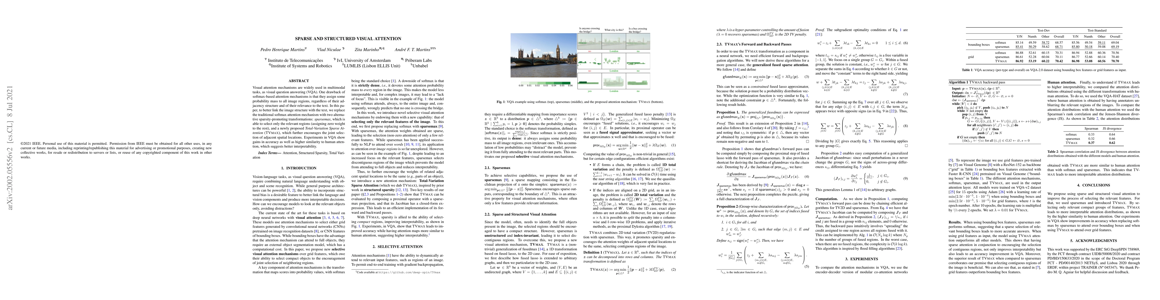 This paper proposes alternative sparsity-promoting attention mechanisms—sparsemax and Total-Variation Sparse Attention (TVmax)—to improve visual question answering (VQA) by better linking image structure with text relevance. Experimental results show improved accuracy and higher similarity to human attention patterns.