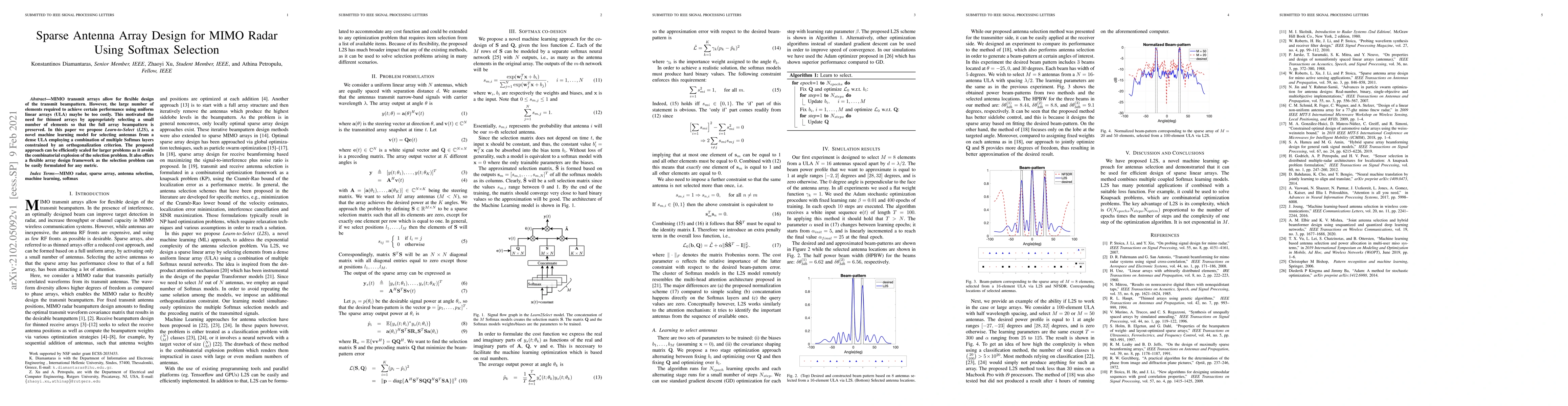 MIMO transmit arrays allow for flexible design of the transmit beampattern. However, the large number of elements required to achieve certain performance using uniform linear arrays (ULA) maybe be too costly. This motivated the need for thinned arrays by appropriately selecting a small number of elements so that the full array beampattern is preserved. In this paper, we propose Learn-to-Select (L2S), a novel machine learning model for selecting antennas from a dense ULA employing a combination of multiple Softmax layers constrained by an orthogonalization criterion. The proposed approach can be efficiently scaled for larger problems as it avoids the combinatorial explosion of the selection problem. It also offers a flexible array design framework as the selection problem can be easily formulated for any metric.