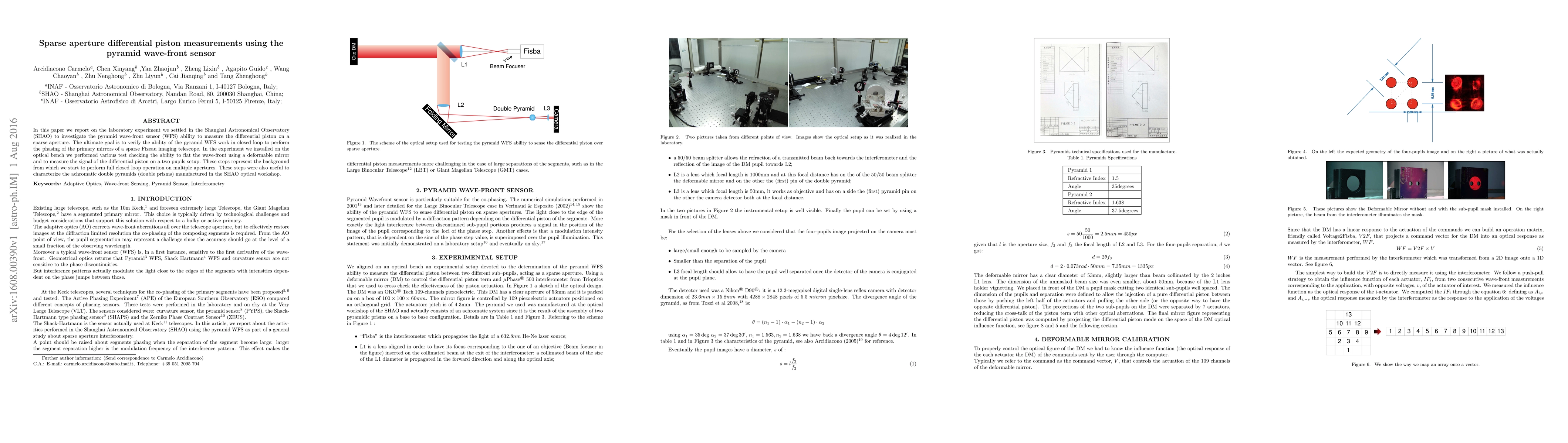 In this paper we report on the laboratory experiment we settled in the Shanghai Astronomical Observatory (SHAO) to investigate the pyramid wavefront sensor (WFS) ability to measure the differential piston on a sparse aperture. The ultimate goal is to verify the ability of the pyramid WFS work in closed loop to perform the phasing of the primary mirrors of a sparse Fizeau imaging telescope. In the experiment we installed on the optical bench we performed various test checking the ability to flat the wave-front using a deformable mirror and to measure the signal of the differential piston on a two pupils setup. These steps represent the background from which we start to perform full closed loop operation on multiple apertures. These steps were also useful to characterize the achromatic double pyramids (double prisms) manufactured in the SHAO optical workshop.