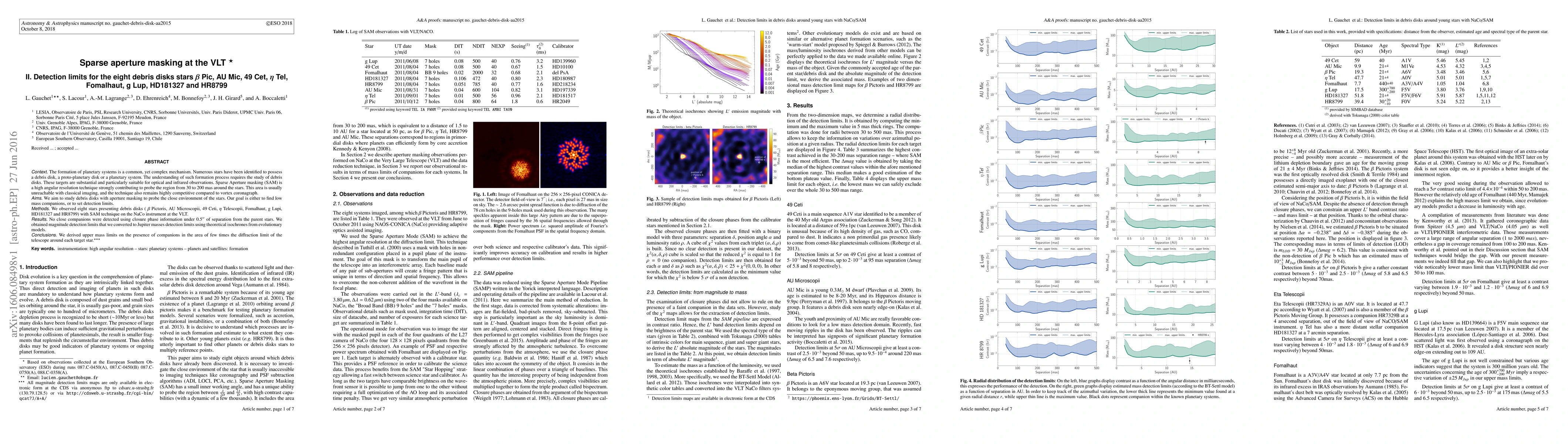 This study utilized Sparse Aperture Masking (SAM) on the VLT to investigate the debris disks around eight stars, aiming to detect low-mass companions or establish detection limits. No close companions were found, and the study set upper mass limits for potential companions in the vicinity of each star.