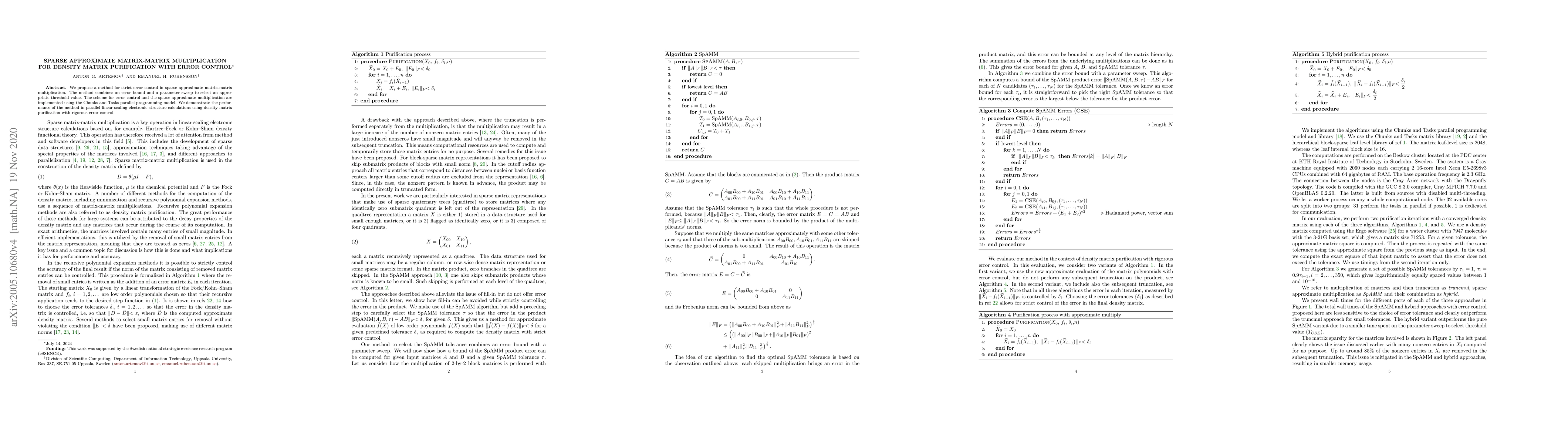 This paper proposes a method for strict error control in sparse approximate matrix-matrix multiplication, combining an error bound and parameter sweep for threshold selection. The method is implemented using the Chunks and Tasks parallel programming model and demonstrated in parallel linear scaling electronic structure calculations for density matrix purification.