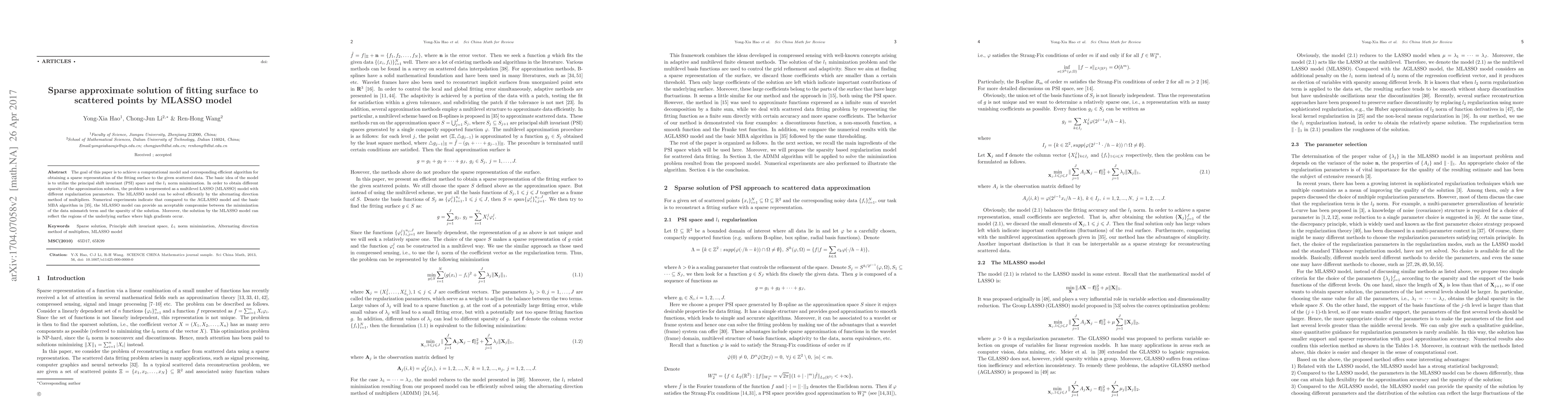 The goal of this paper is to achieve a computational model and corresponding efficient algorithm for obtaining a sparse representation of the fitting surface to the given scattered data. The basic idea of the model is to utilize the principal shift invariant (PSI) space and the l1 norm minimization. In order to obtain different sparsity of the approximation solution, the problem is represented as a multilevel LASSO (MLASSO) model with different regularization parameters. The MLASSO model can be solved efficiently by the alternating direction method of multipliers. Numerical experiments indicate that compared to the AGLASSO model and the basic MBA algorithm, the MLASSO model can provide an acceptable compromise between the minimization of the data mismatch term and the sparsity of the solution. Moreover, the solution by the MLASSO model can reflect the regions of the underlying surface where high gradients occur.