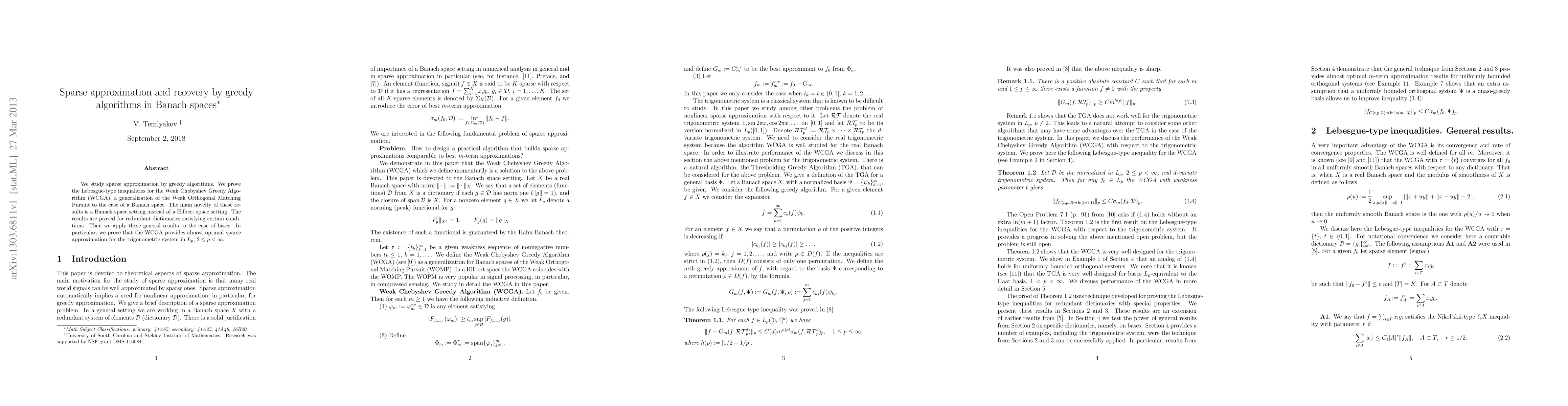 This paper investigates sparse approximation using the Weak Chebyshev Greedy Algorithm (WCGA) in Banach spaces, proving Lebesgue-type inequalities for this method. It demonstrates the WCGA's effectiveness in almost optimal sparse approximation for the trigonometric system in $L_p$ spaces, extending results from Hilbert to Banach space settings.