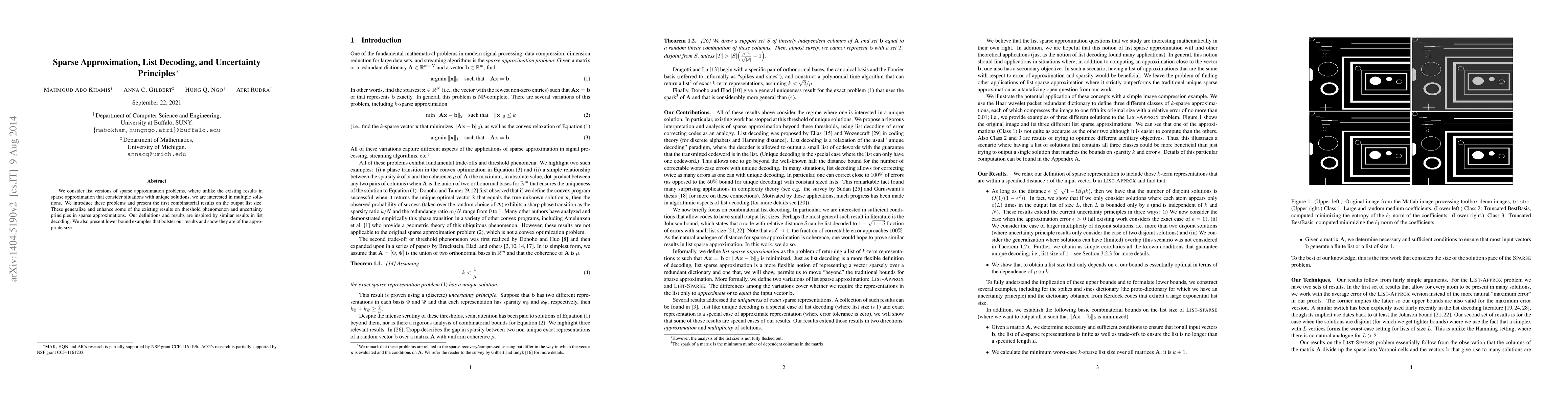 We consider list versions of sparse approximation problems, where unlike the existing results in sparse approximation that consider situations with unique solutions, we are interested in multiple solutions. We introduce these problems and present the first combinatorial results on the output list size. These generalize and enhance some of the existing results on threshold phenomenon and uncertainty principles in sparse approximations. Our definitions and results are inspired by similar results in list decoding. We also present lower bound examples that bolster our results and show they are of the appropriate size.