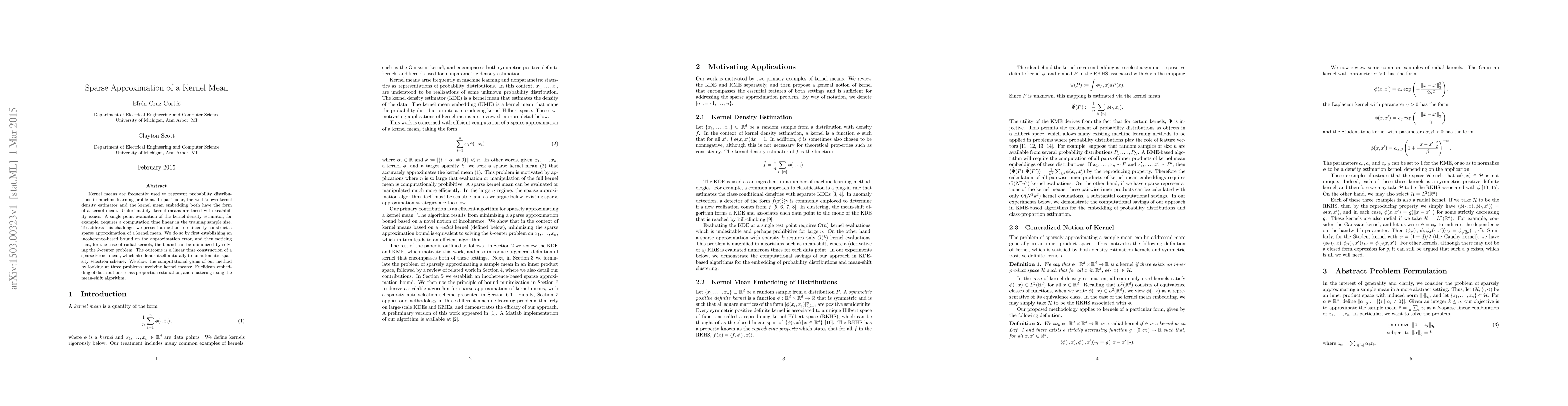 This paper proposes a method for efficiently constructing a sparse approximation of a kernel mean to address scalability issues in kernel density estimation and kernel mean embedding. The method minimizes approximation error through an incoherence-based bound and solves the $k$-center problem, leading to a linear time construction and automatic sparsity selection.